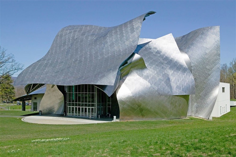 Nhà hát The Richard B.Fisher, New York, Mỹ có kiến trúc bên ngoài ấn tượng với những đường lượn sóng màu bạc phản quang, hòa hợp với không gian thiên nhiên xanh bên ngoài.