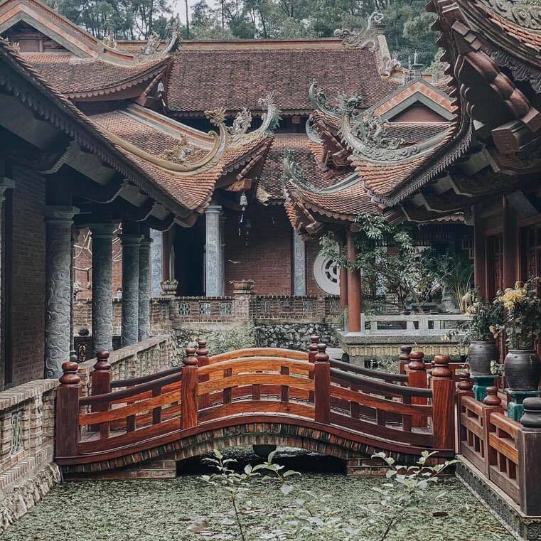 Chùa được xây dựng với lối kiến trúc cột chèo truyền thống Bắc Bộ, kết hợp cùng nét đẹp đậm chất hoàng cung, bên trên các chi tiết đều được chạm trổ hoa văn vô cùng tinh tế, riêng biệt mà không thể tìm thấy ở bất kì ngôi chùa nào khác. Những bức tường bằng gạch đỏ hung, những mái ngói cong cong,…giúp nơi đây thêm phần trang nghiêm.