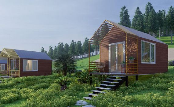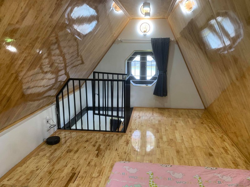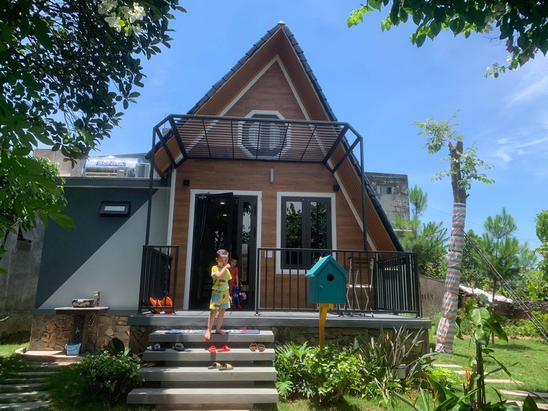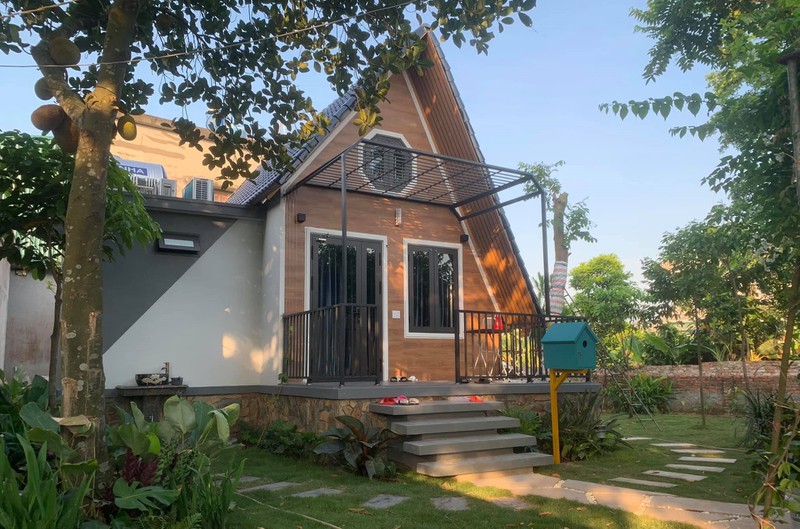 Phần tường bên ngoài được dùng gạch giả gỗ ốp, tạo sự gần gũi với làng quê. Bên trong đủ chỗ ngủ cho 4 người, có 2 nhà vệ sinh.