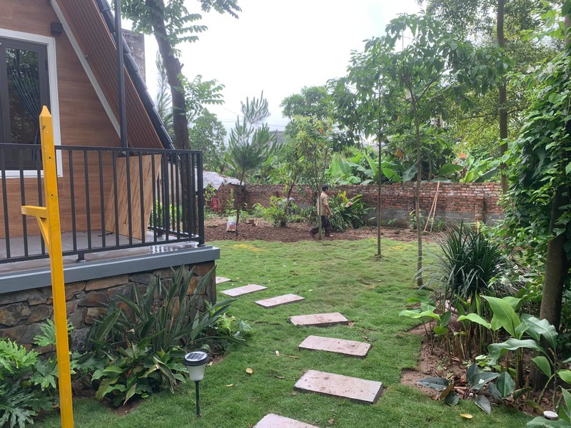 Cảnh quan đang được cải tạo, trải thảm cỏ và trồng thêm cây ăn quả. Lối đi dùng phiến đá trắng, có độ nhám, tạo sự ma sát và đề phòng trơn trượt vào ngày mưa.