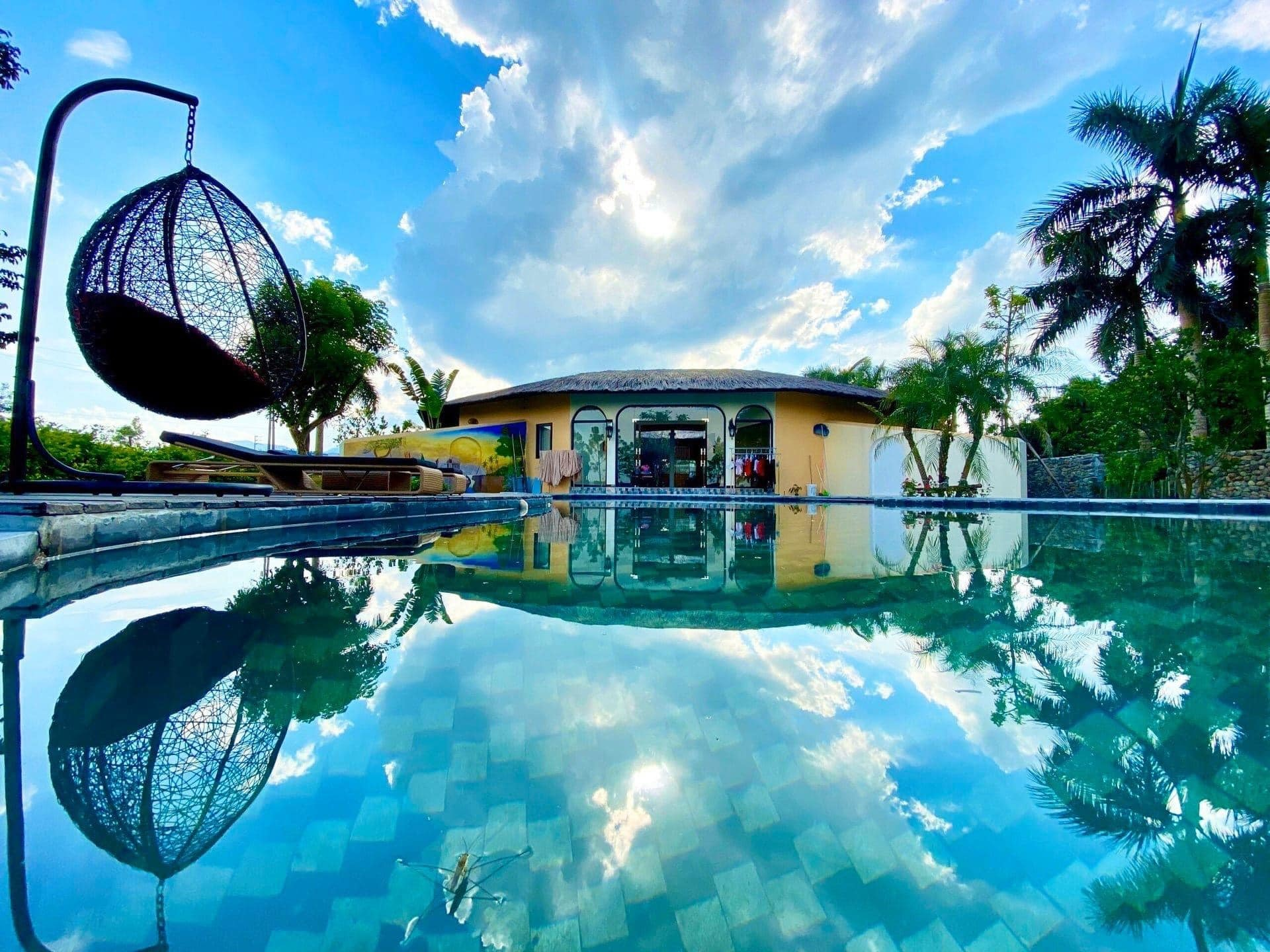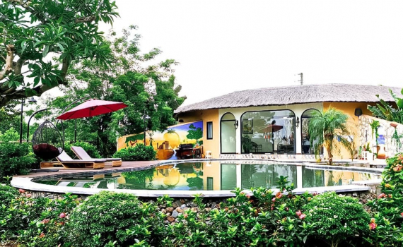 Với diện tích 2000m2, vợ chồng chị Khổng Thanh (Hà Nội) đã xây khu nhà mái lá dân dã với cấu trúc hình tròn, xung quanh có 6 phòng ngủ khép kín và 1 bể bơi ngoài trời xanh mát.