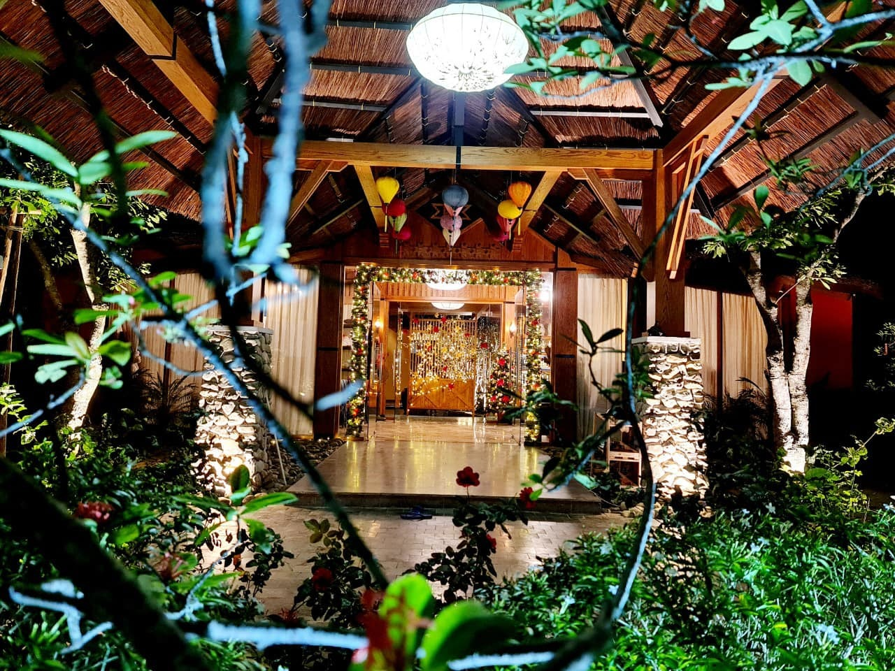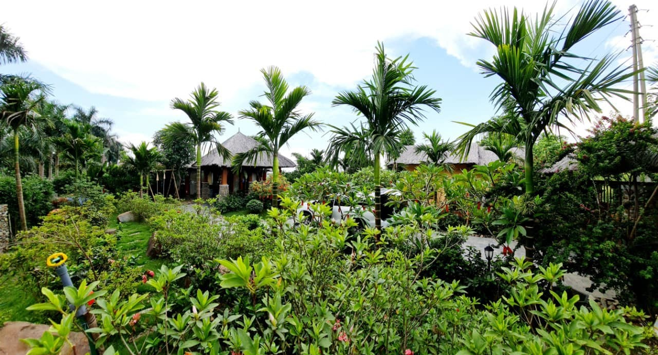 Nhà chòi ngồi chơi cũng được lợp lá, bao quanh là các khóm hoa, cây cảnh. Đường đi trong khu nhà lát gạch.