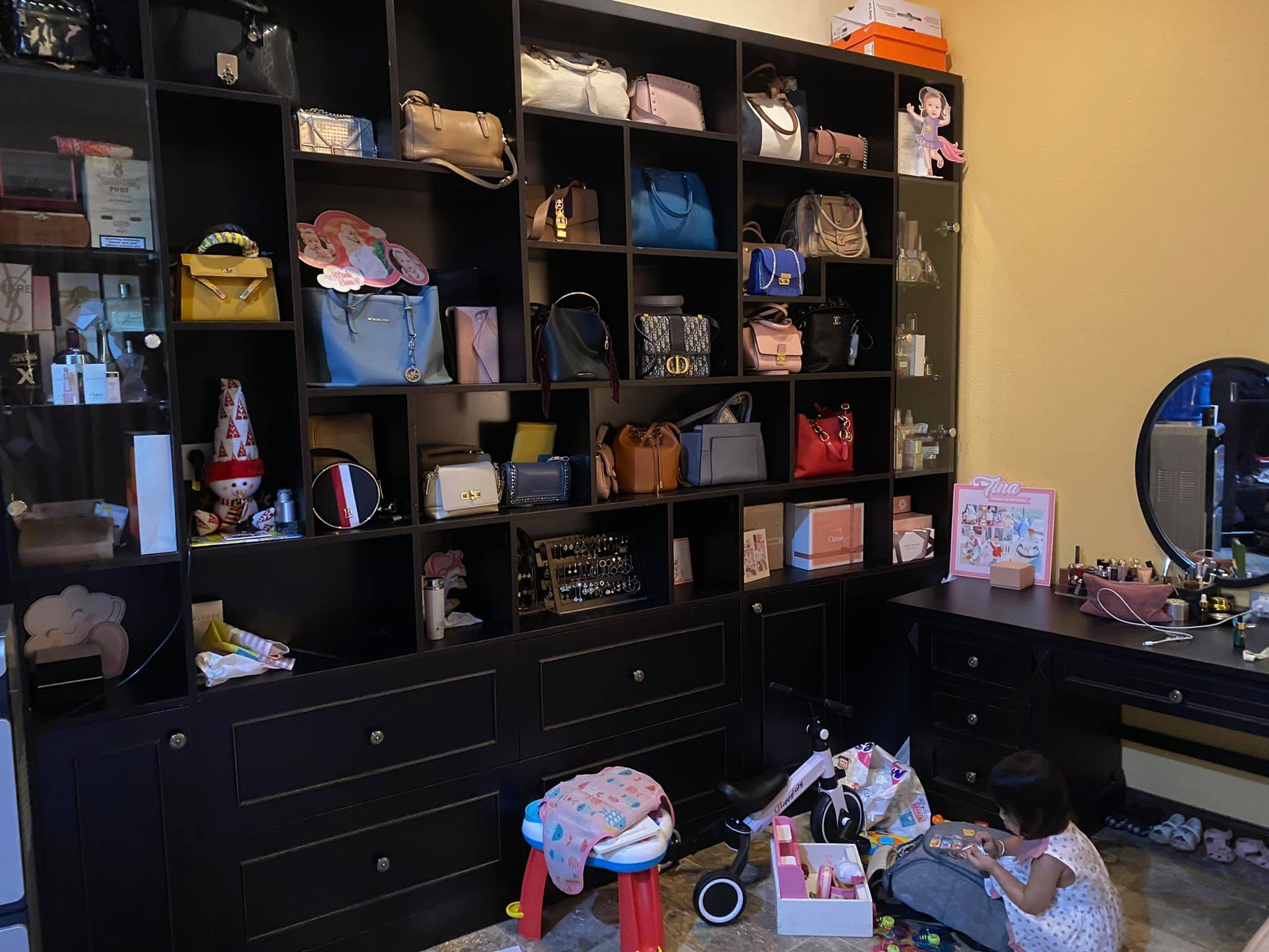 Phòng ngủ chính của hai vợ chồng, thiết kế hơi hướng cổ điển. Trong phòng có thêm bàn trang điểm và kệ bày túi xách.