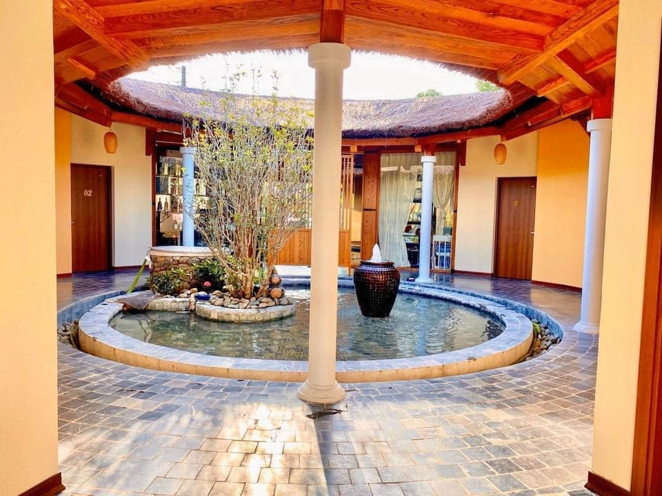 Nhà xây theo hình tròn, lợp mái lá chống nóng. Phía trước là bể bơi.