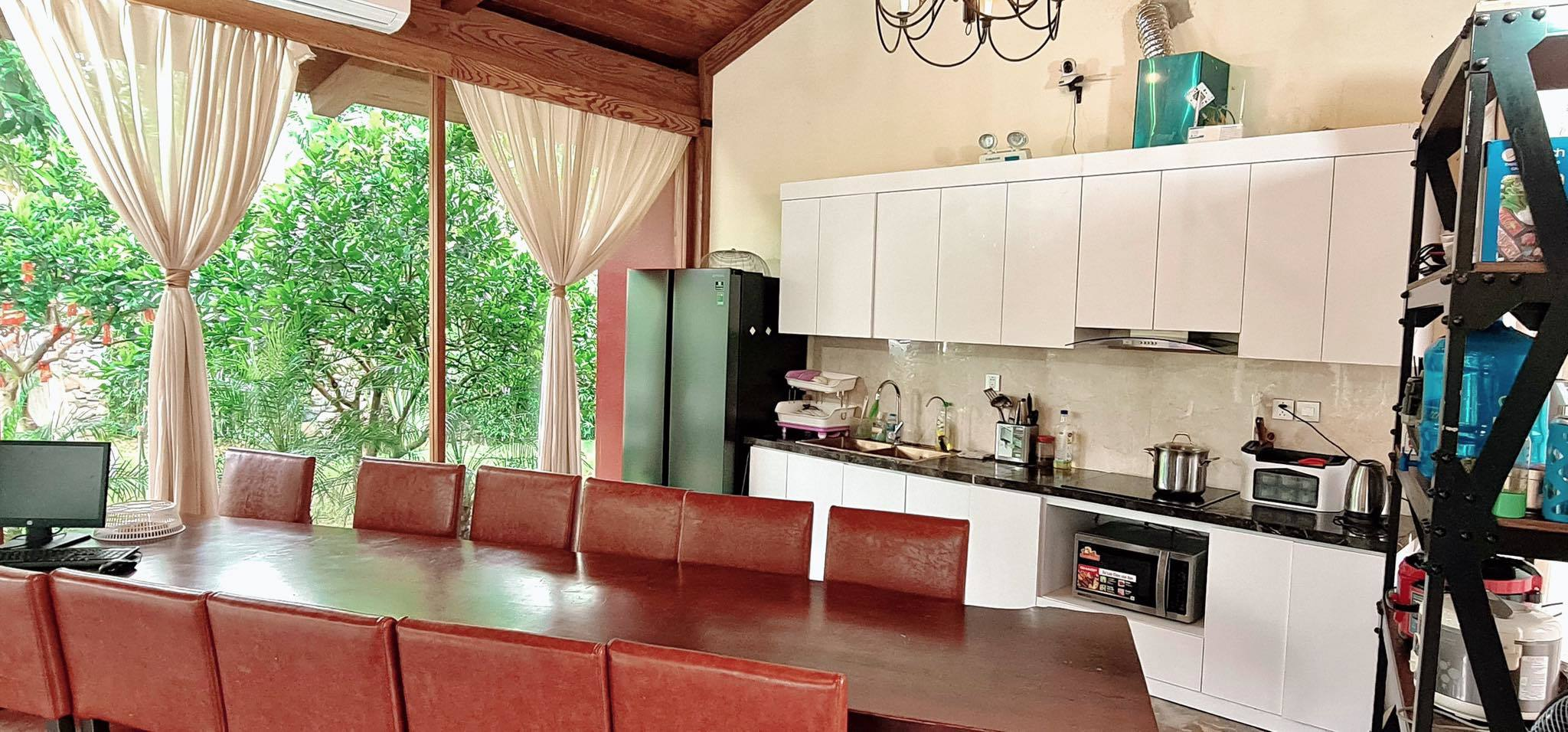 Phòng bếp, ăn phục vụ được cho khoảng 12 người. Do gia đình ở đây cũng nhiều nên chị Thanh đầu tư nhiều thiết bị hiện đại, bao gồm cả lò nướng bánh.