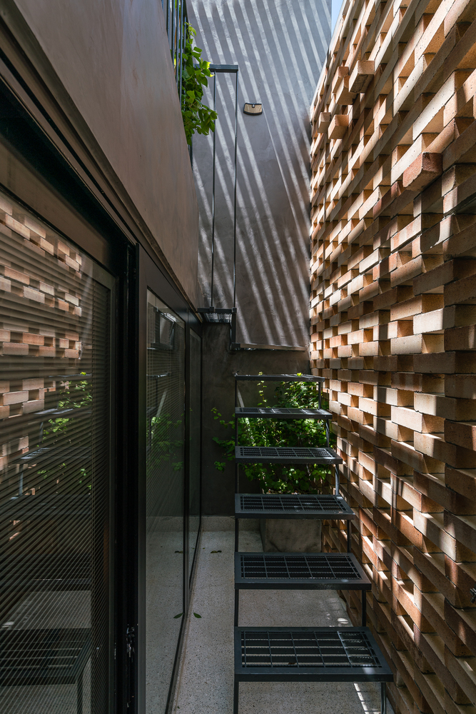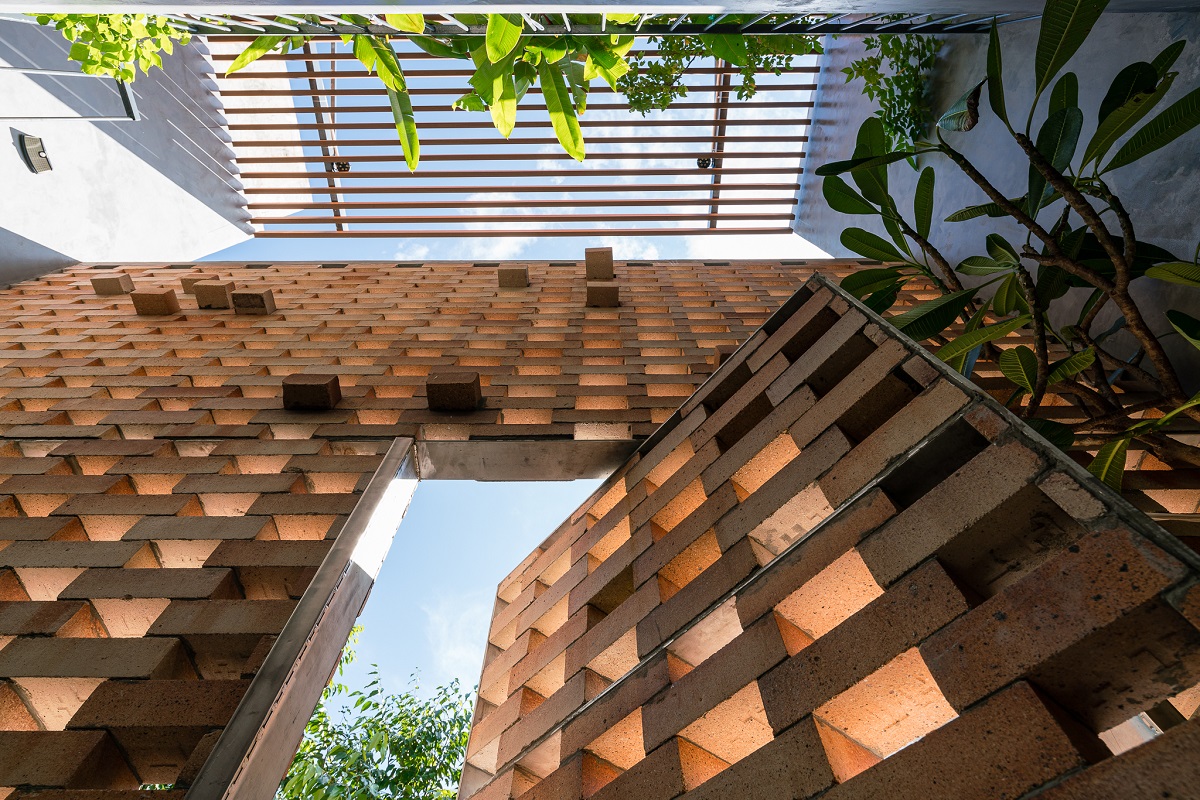 Với dự án này, kiến trúc sư tạo ra “lớp vỏ” thứ nhất bằng gạch (gạch chịu lửa – bền chắc, nhẹ, ít bám bụi) bao quanh cả mặt trước và sau.
