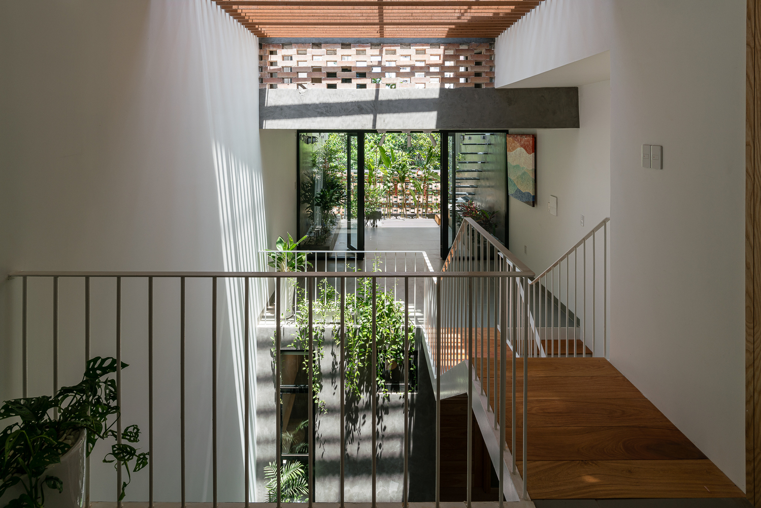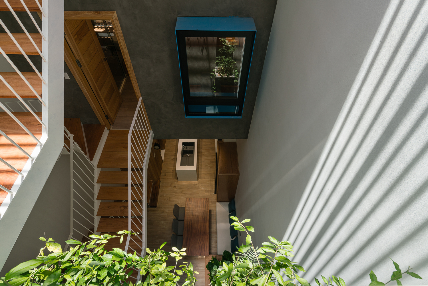 Hệ cầu thang giữa và phía trước căn nhà tạo vừa tạo ra sự linh hoạt cho giao thông (ở phòng ngủ có thể lên thẳng vườn trên sân thượng mà không cần phải đi từ cầu thang giữa nhà) vừa tạo ra những góc nhìn những khoảng mở tạo sự trải nghiệm và khám phá mỗi ngày cho chính người sử dụng.