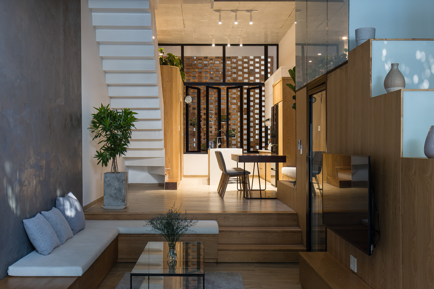 Cấu trúc lệch tầng được sử dụng linh hoạt ở giữa ngôi nhà và bên ngoài ban công, tạo ra những khoảng mở cho các góc nhìn từ phòng khách – phòng ăn.