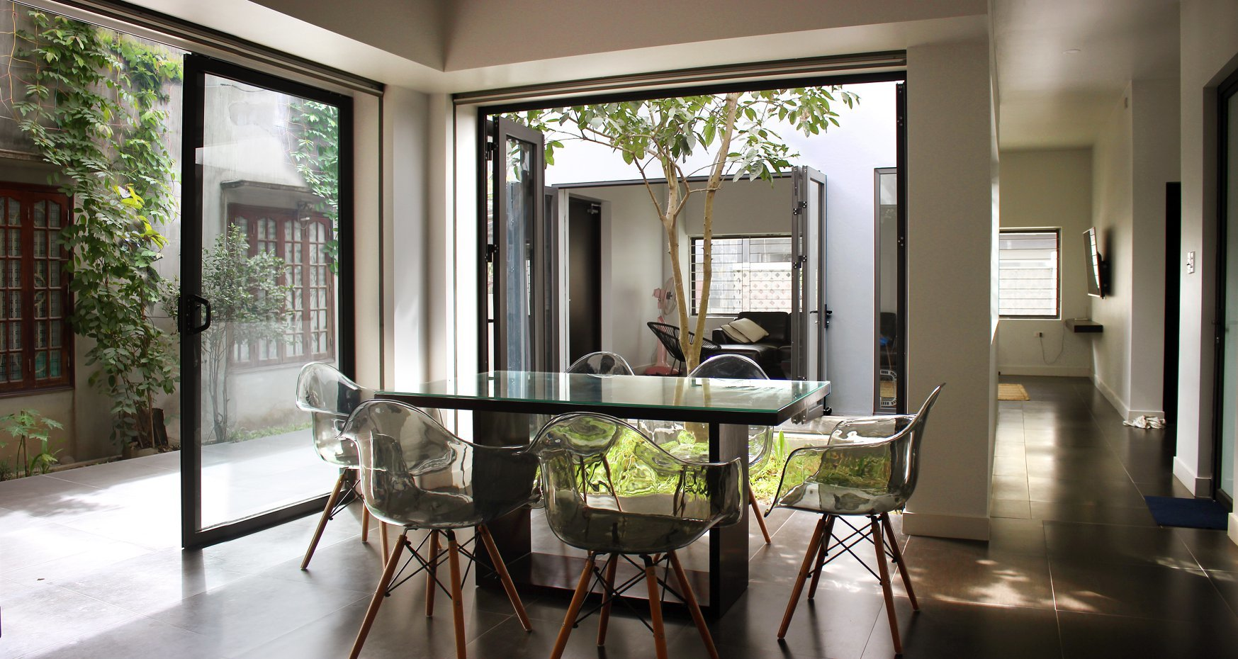 Hoa nắng nơi phòng ăn, từ đây bạn có thể phóng tầm mắt ra bao quát khắp nhà và vườn.