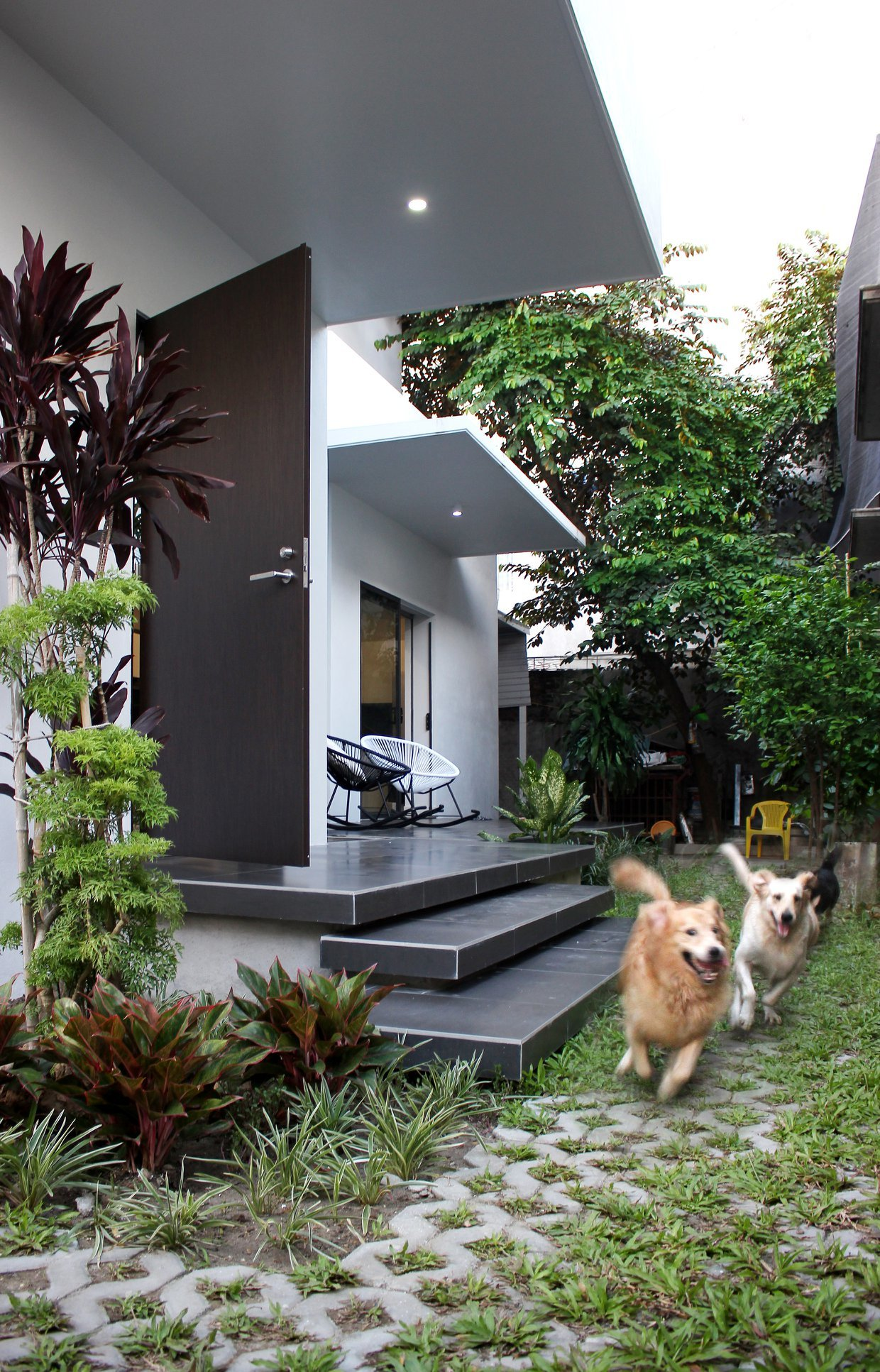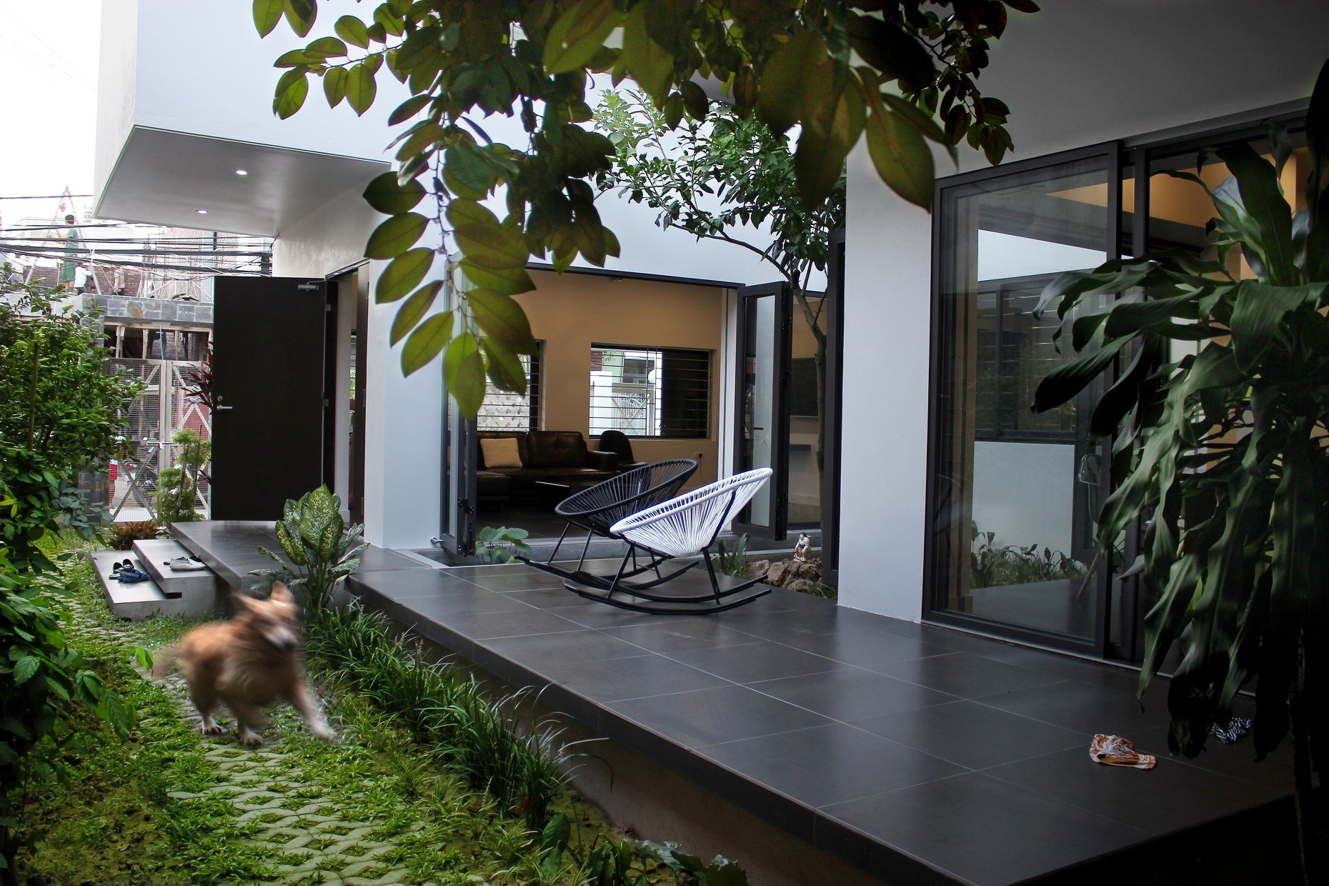 Nhìn từ bên ngoài thì nhà kín bưng. Ta có thể thấy công trình chia thành 2 phần rõ rệt.