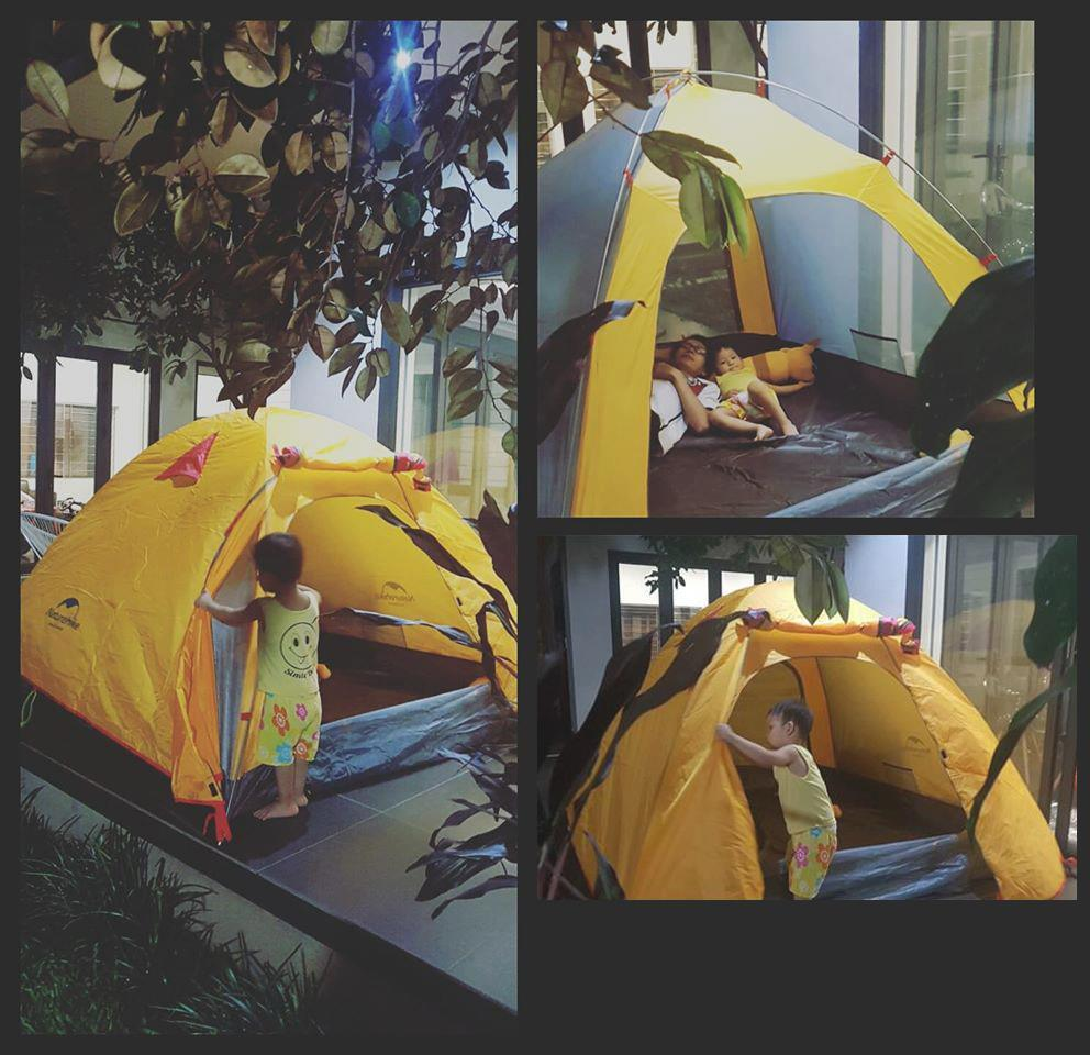 Chiếc lều bằng vải dù, chồng chị Thủy tặng các con. Con trai chị háo hức trải hết ra hiên rồi bắt đầu lắp ráp. Sau một hồi bận rộn, lều cũng thành hình. "Khoảng sân trong không quá lớn nhưng đủ chỗ cho con tôi trải nghiệm tuổi thơ, được cắm trại tại gia", chị Thủy cho hay.