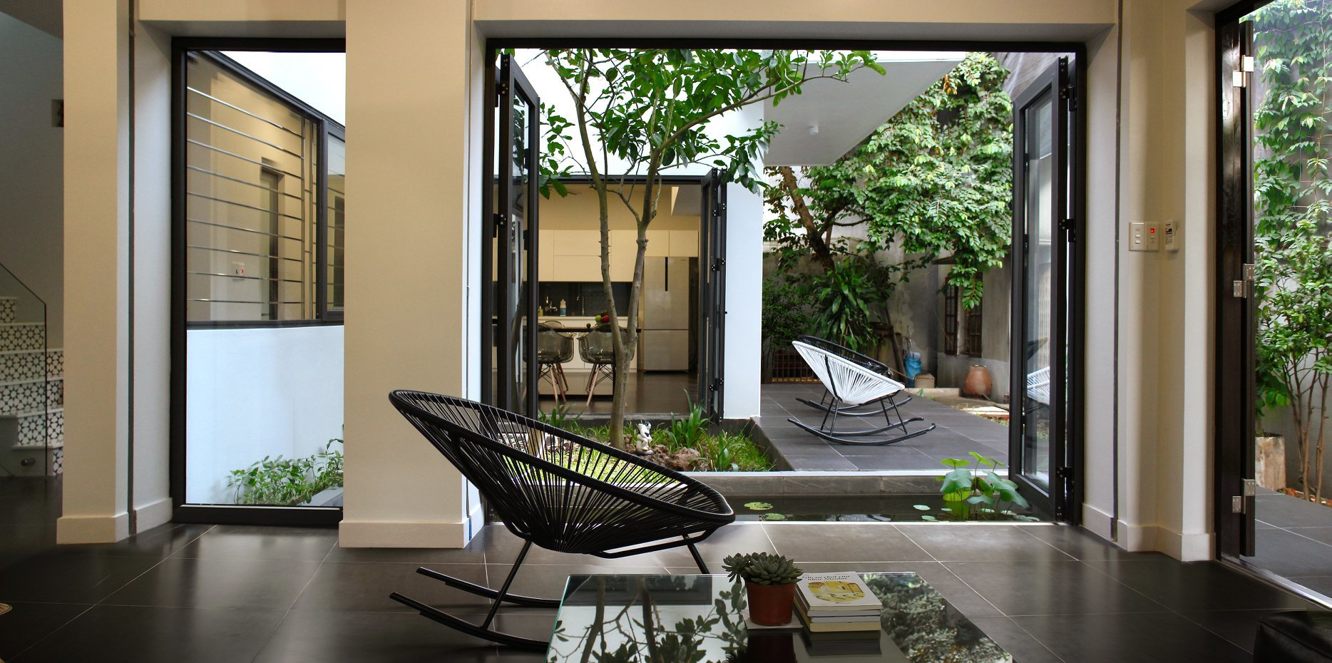 Những ngày "sống chậm", chị Thủy ngồi ghế acapulco thư giãn, đọc sách và cảm nhận đất trời chuyển mùa. Kiến trúc sư Trịnh Hải Long - chồng chị Thủy chia sẻ, hai bên cửa có khe rãnh là do lắp cửa cuốn chống trộm giấu lô trên trần thạch cao.