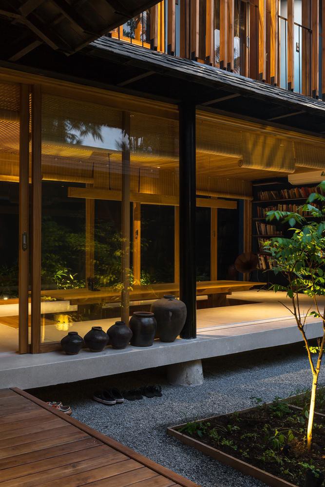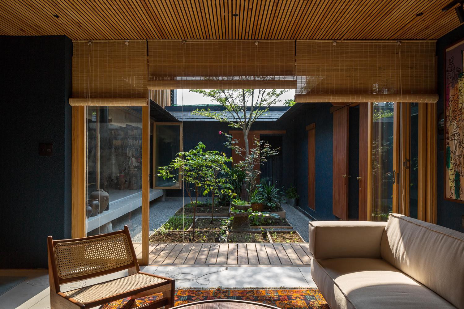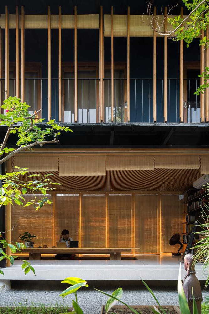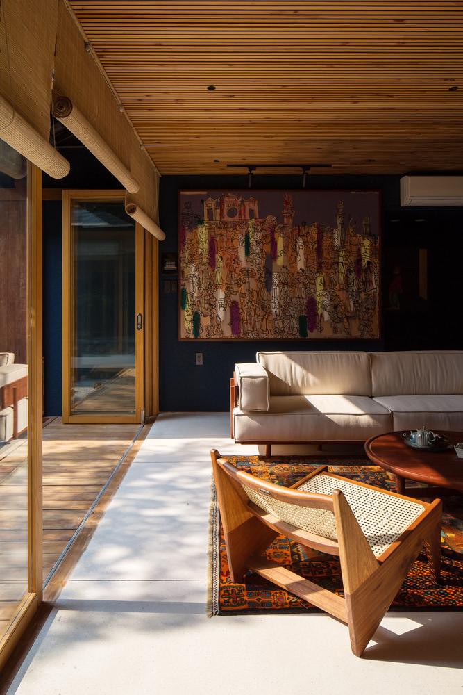 Ngoài cửa kính, ngôi nhà còn sử dụng rèm che bằng trúc để giảm sự chói chang của ánh sáng vào những ngày hè.