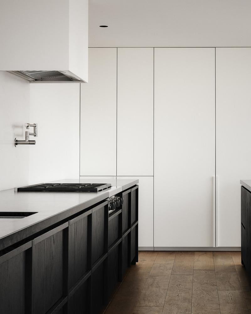 Họ cũng làm việc với các thợ đá để chế tạo tùy chỉnh bàn trang điểm và chậu rửa bằng đá mài màu đen cho phòng tắm chính. Sàn gạch nung màu đen của phòng tắm mở rộng liền mạch với vòi hoa sen, mang đến sự liên tục về mặt hình ảnh khi mở rộng sàn gỗ của phòng ngủ chính đến tấm ốp của khu vực thay quần áo.
