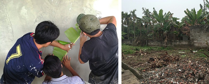 Ngoài ra, các thợ thủ công còn sử dụng phương pháp khắc tay “intaglio”, dùng lá chuối ép lên bề mặt của bức tường bê tông.