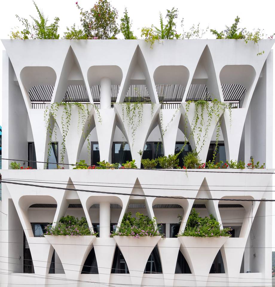 Ngoài mặt tiền, các bồn cây mô phỏng hình ảnh đôi tay nâng niu mảng xanh. Chúng vừa tăng sức sống cho công trình, vừa tạo nên điểm nhấn.