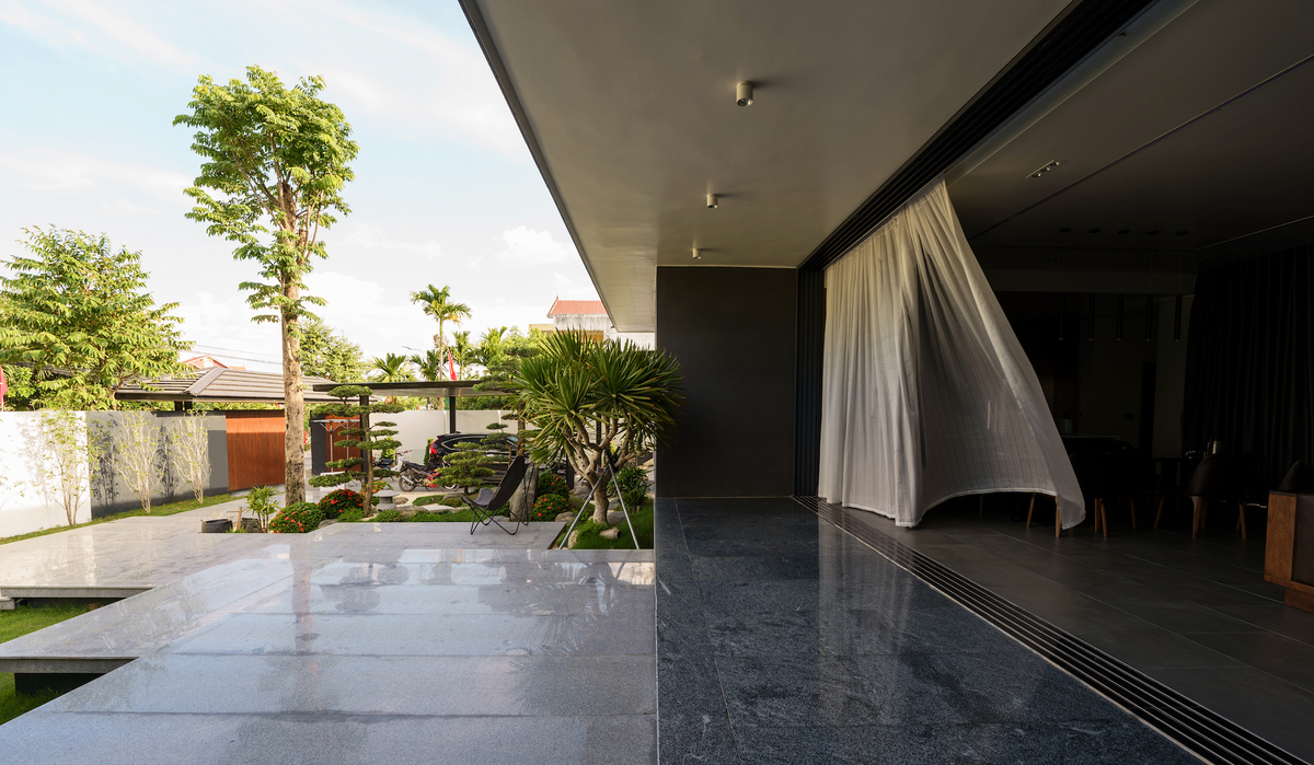 Nằm giữa các đô thị có cốt nền cao, khu vực này trở thành vũng trũng, hàng năm phải chịu những đợt triều cường gây lụt, có lúc mức nước cao hơn mặt đường 1,2 mét. Để đảm bảo an toàn cho căn nhà, nhóm thiết kế đã nâng toàn bộ khu vực công trình cao lên 1,4 mét. Họ đồng thời tạo kiến trúc cảnh quan xung quanh thoải dần ra xa, tạo cảm giác căn nhà đang ở lưng chừng đồi.