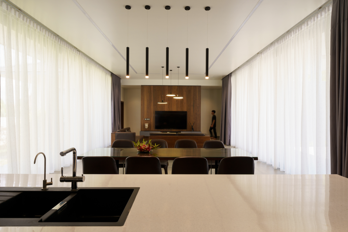 Để phù hợp với nhiều độ tuổi khác nhau, nội thất được phối trộn giữa "gu" của các thành viên. Ví dụ, không gian sinh hoạt chung có màu trung tính.