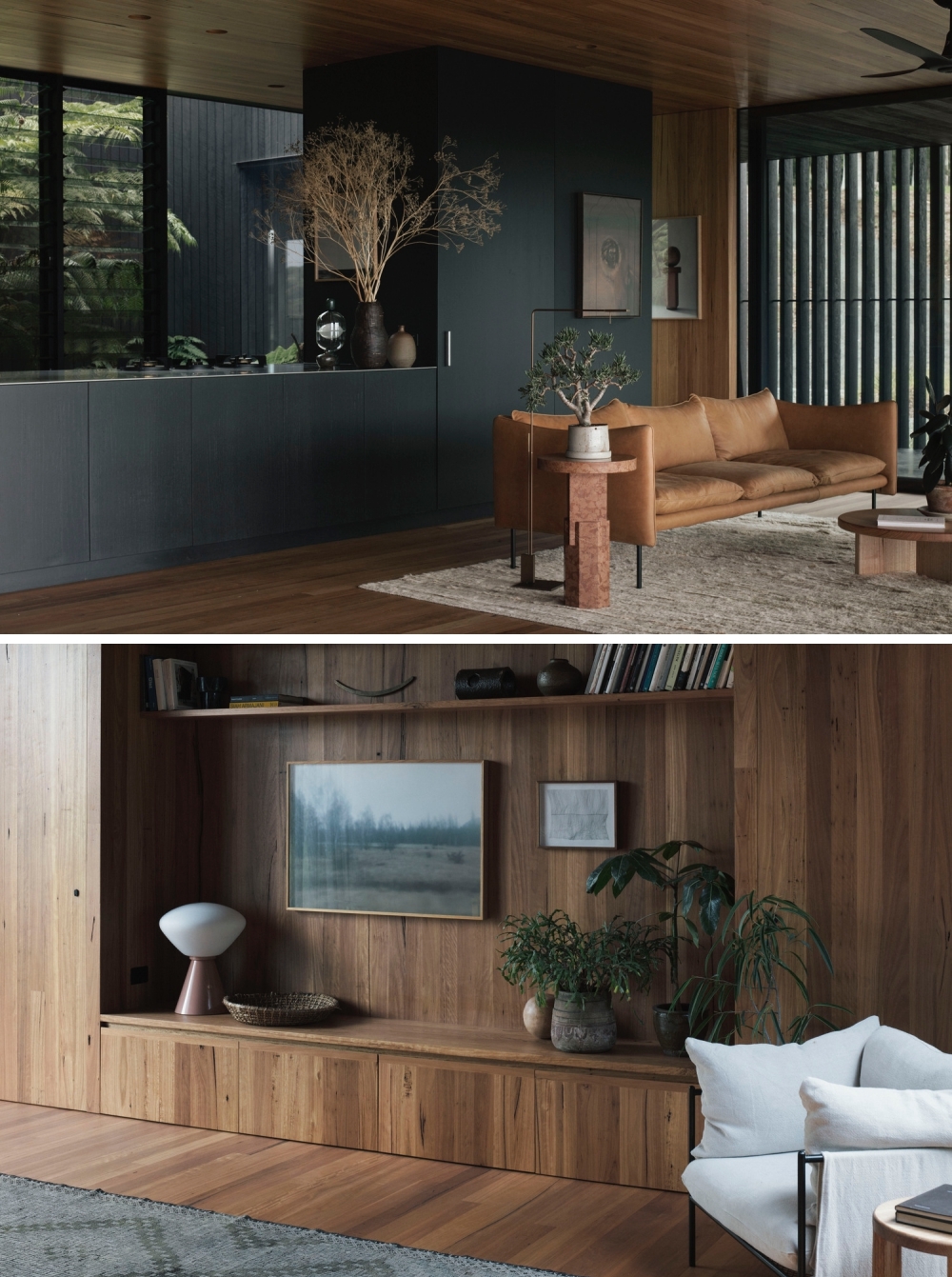 Gỗ tối đen và bê tông màu xám tạo sự tương phản với sàn màu nâu sáng và nội thất màu da.