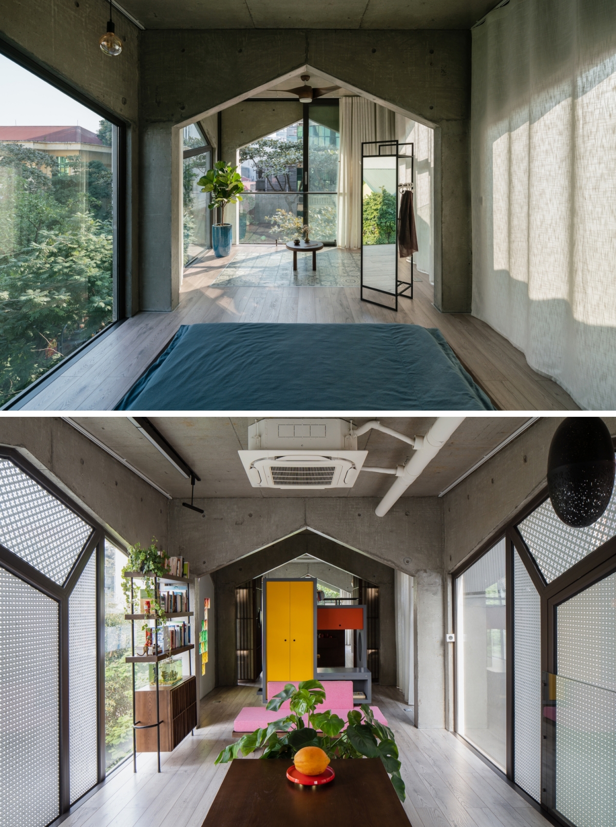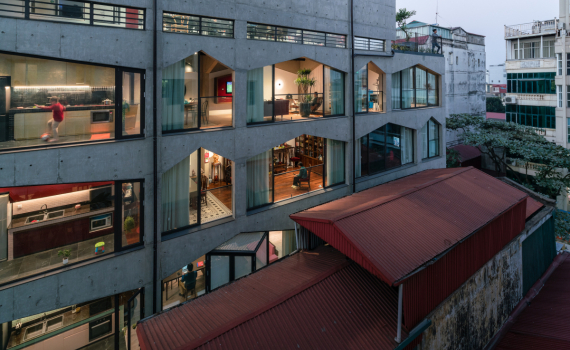 Đây là thiết kế của kiến trúc sư Vũ Hoàng Sơn và Vũ Hoàng Hà. Xây dựng trên chính nền ngôi nhà cũ của họ, nhóm thiết kế hướng đến sự đa năng và linh hoạt về công năng, phù hợp với nhiều nhu cầu sử dụng khác nhau trong bối cảnh chật chội của đô thị.