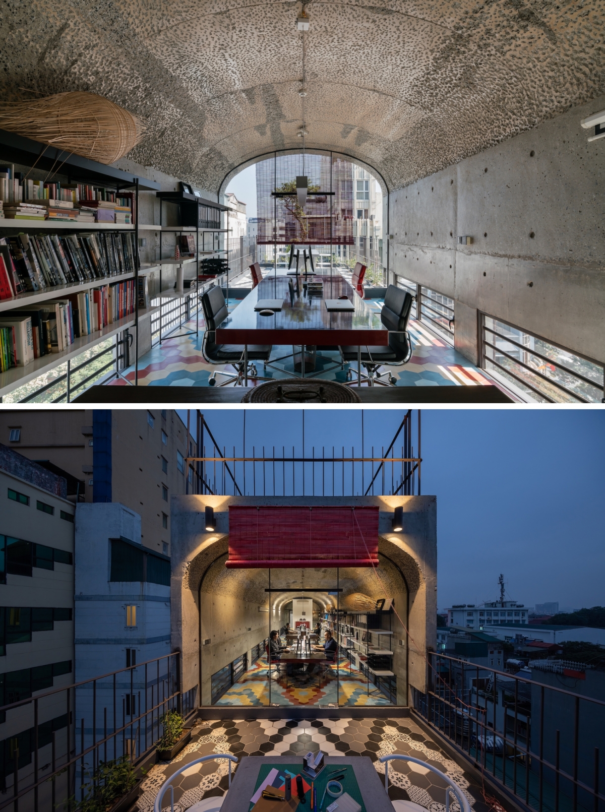So với các tầng dưới, tầng tám, tầng trên cùng là văn phòng của gia chủ, khác biệt nhất nhờ phần trần cong và mở ra sân ngoài trời.