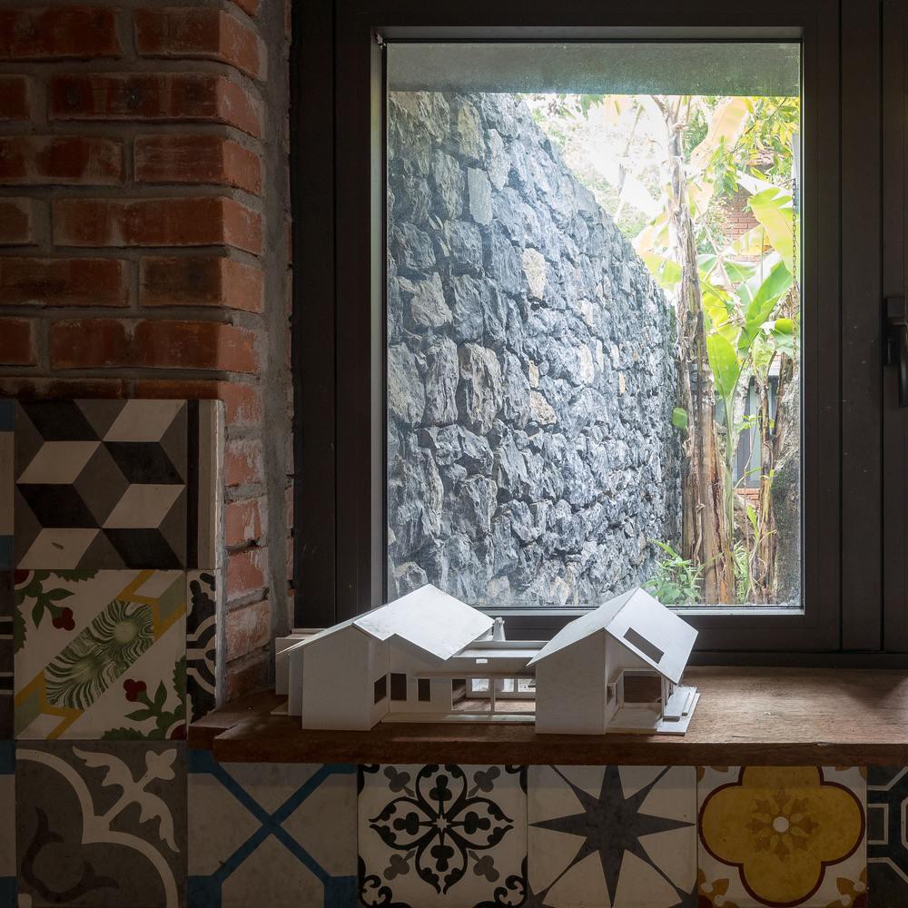 Mảnh đất xây dựng ngôi nhà khá rộng rãi với nhiều cây cổ thụ, nằm trên một sườn đồi thoải có những mỏm đá nhỏ lô nhô, do đó thay vì đổ xi măng, sân trước được lát đá để tạo cảm giác xưa cũ cho không gian.