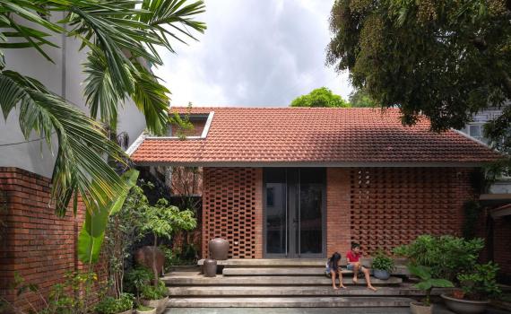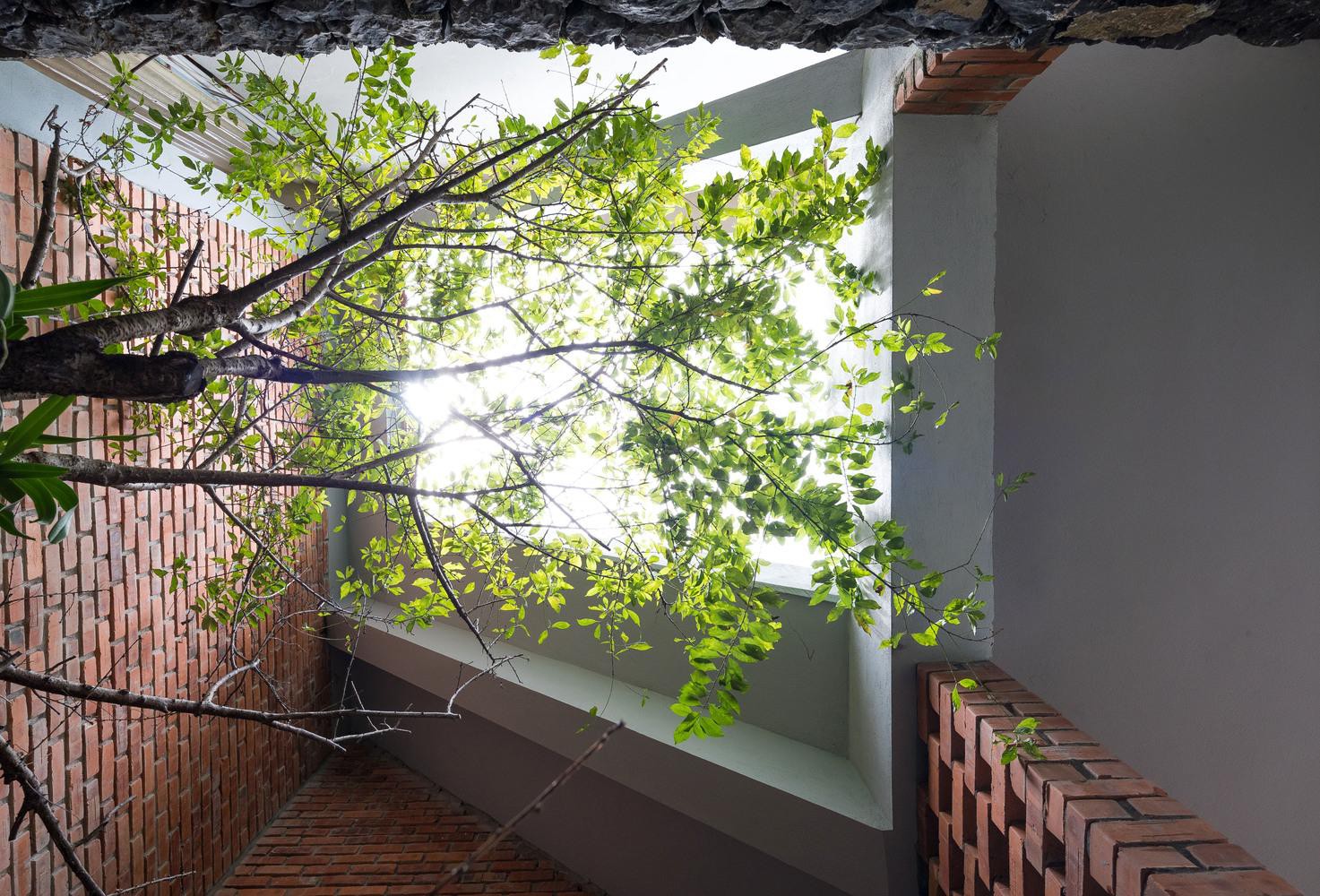 Ở mặt tiền, sau lớp gạch đỏ là lớp cửa kính trong suốt để ánh sáng và tầm nhìn không bị giới hạn.
