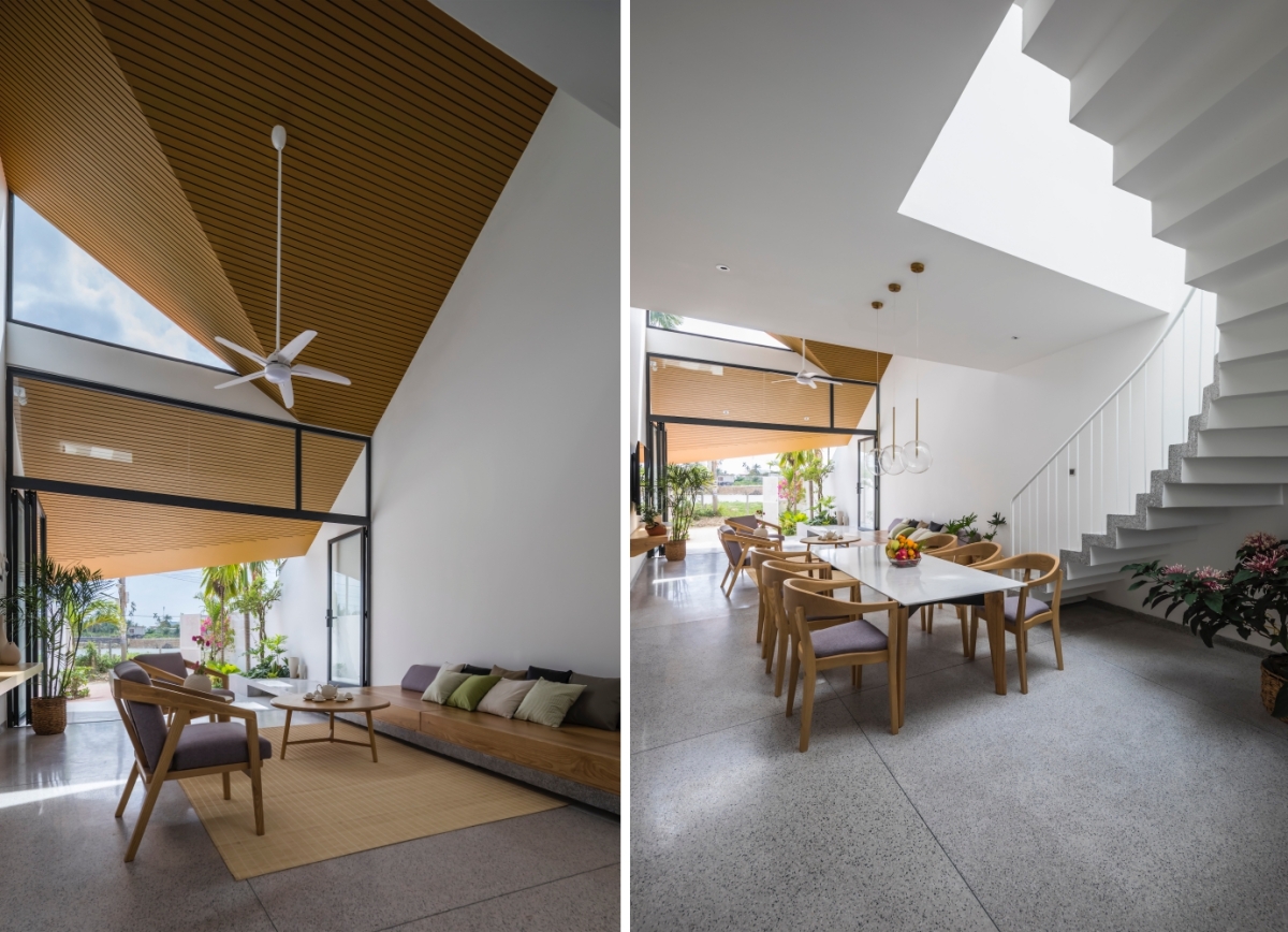 Từ sân vào, không gian mở rộng theo chiều cao. Phòng khách kết nối với tầng trên bằng khoảng thông tầng. Đến khu vực bàn ăn phía sau phòng khách, phần trần được hạ thấp để "đóng" dần không gian.