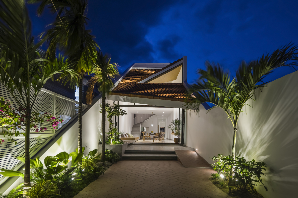 Phía trước nhà, nhóm thiết kế bố trí một khoảng lùi để làm sân trước, hai bên trồng cau và cây xanh. Sân lát gạch Tàu, vừa tạo sự liên kết với mái ngói vừa gợi nhớ hình ảnh sân những ngôi nhà Việt xưa.