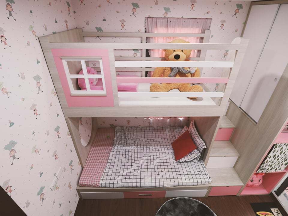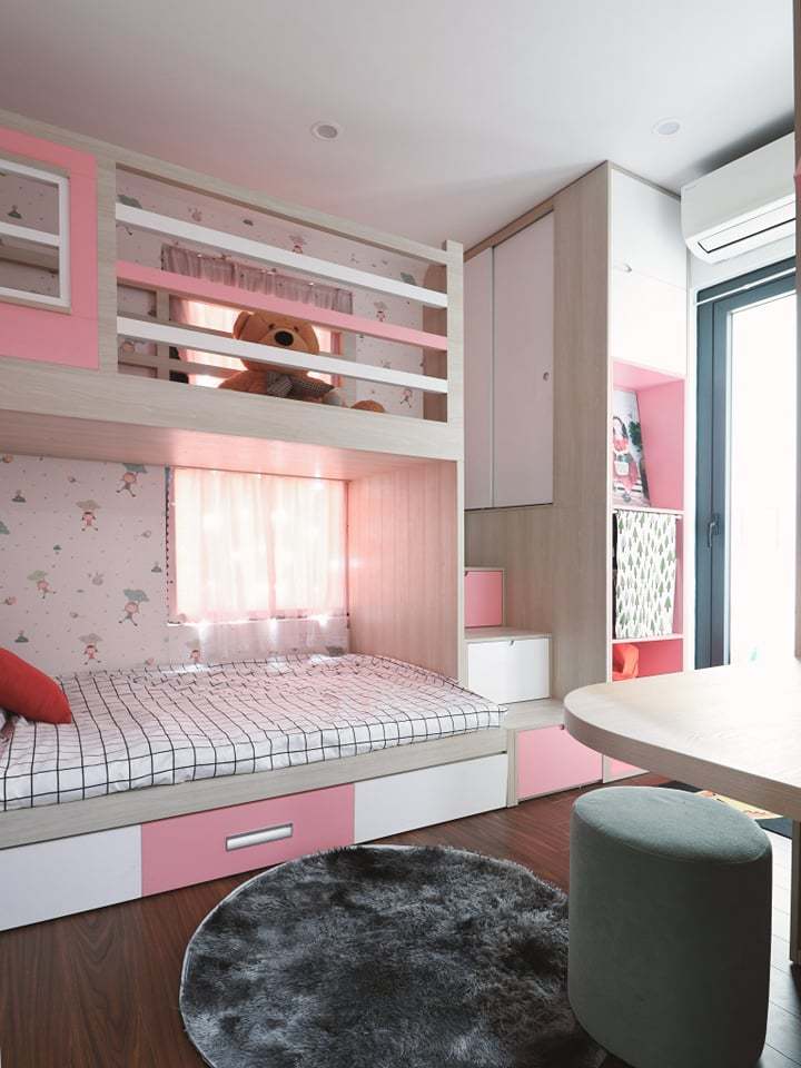 Phòng ngủ dễ thương của con gái gia chủ với sự hòa trộn giữa hồng pastel, hồng đậm và trắng. Giường tầng tích hợp tủ quần áo, ngăn kéo nên đồ đạc được sắp xếp gọn gàng. Với căn hộ nhỏ, đồ đạc càng gọn gàng, không gian càng thoáng mát.
