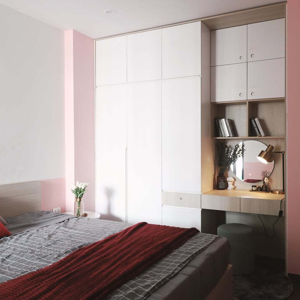 Phòng ngủ bố mẹ với kho tủ lưu trữ kết hợp bàn làm việc, bàn trang điểm nhỏ gọn, tiết kiệm diện tích.