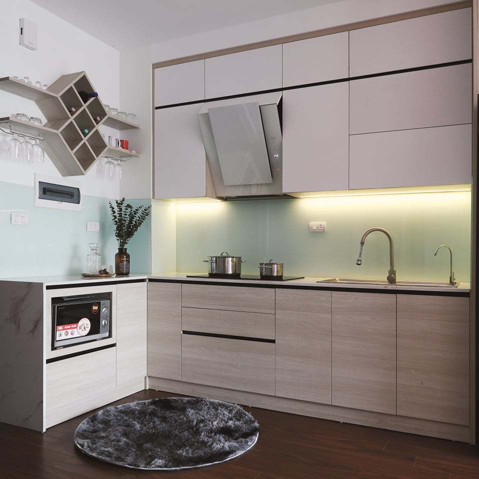 Bếp nằm ngay lối cửa ra vào, vì thế kiến trúc sư thiết kế sao cho gọn nhất, không để bị rối mắt. Tông màu gỗ giúp tăng sự nhẹ nhàng cho căn hộ. "Hiện nay, nhiều căn hộ chung cư mới đều đặt khu bếp nấu ở gần cửa. Nếu không bố trí hợp lý, tham lam nhiều chi tiết sẽ mang lại cảm giác ngột ngạt khi bước chân vào nhà", kiến trúc sư Trịnh Đình Quyền nói.