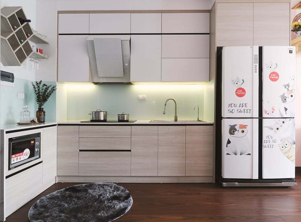 Tủ lạnh được gia chủ decor thêm lớp hình họa mèo siêu yêu.