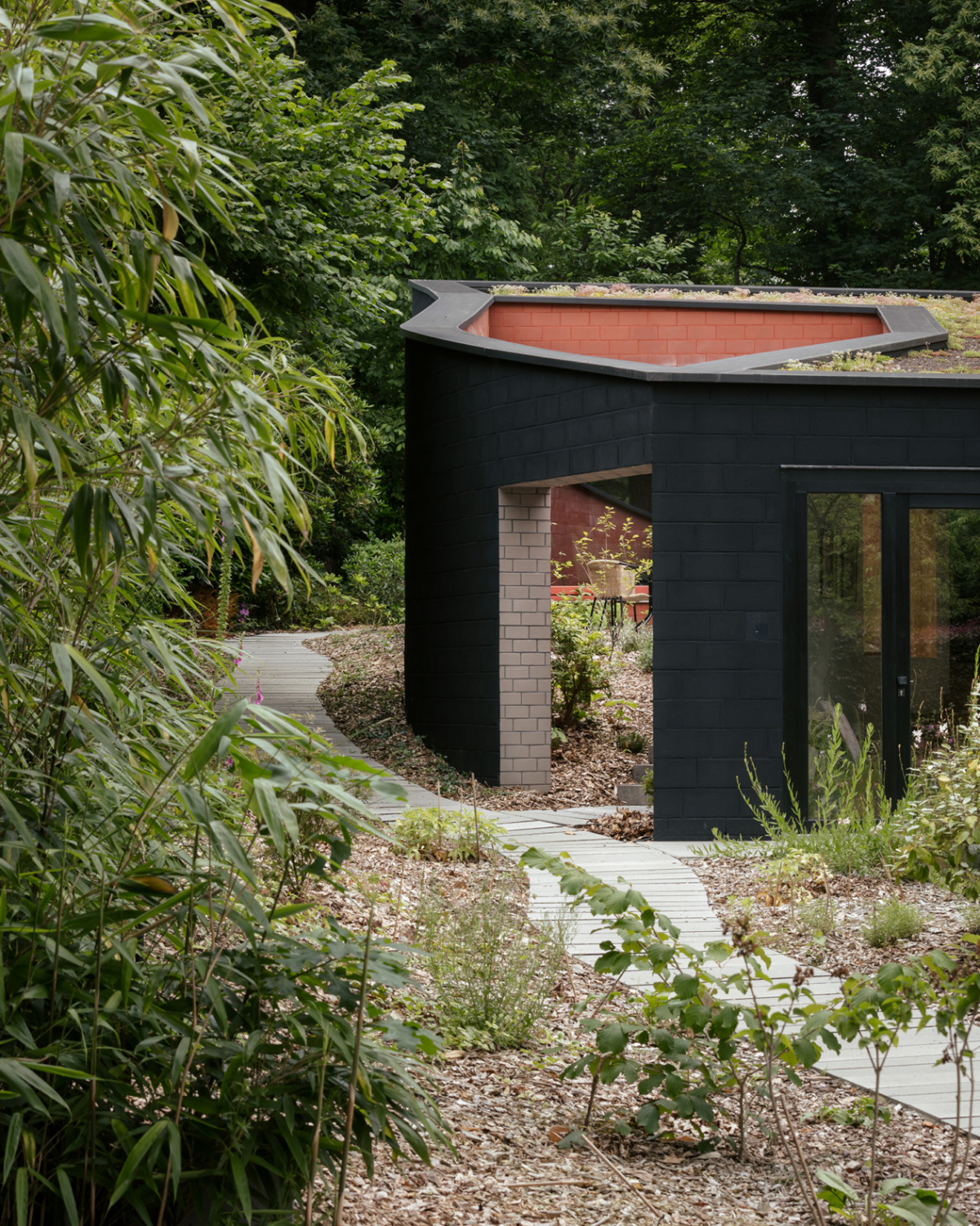 "Phòng ngoài trời" được thiết kế liền kề với phòng khách và hành lang rộng rãi. "Căn phòng" này kết thúc bằng một bức tường trong khu vườn không có mái che tạo ra không gian mở và có cảm giác con đường vẫn kéo dài chứ không phải bị cụt.