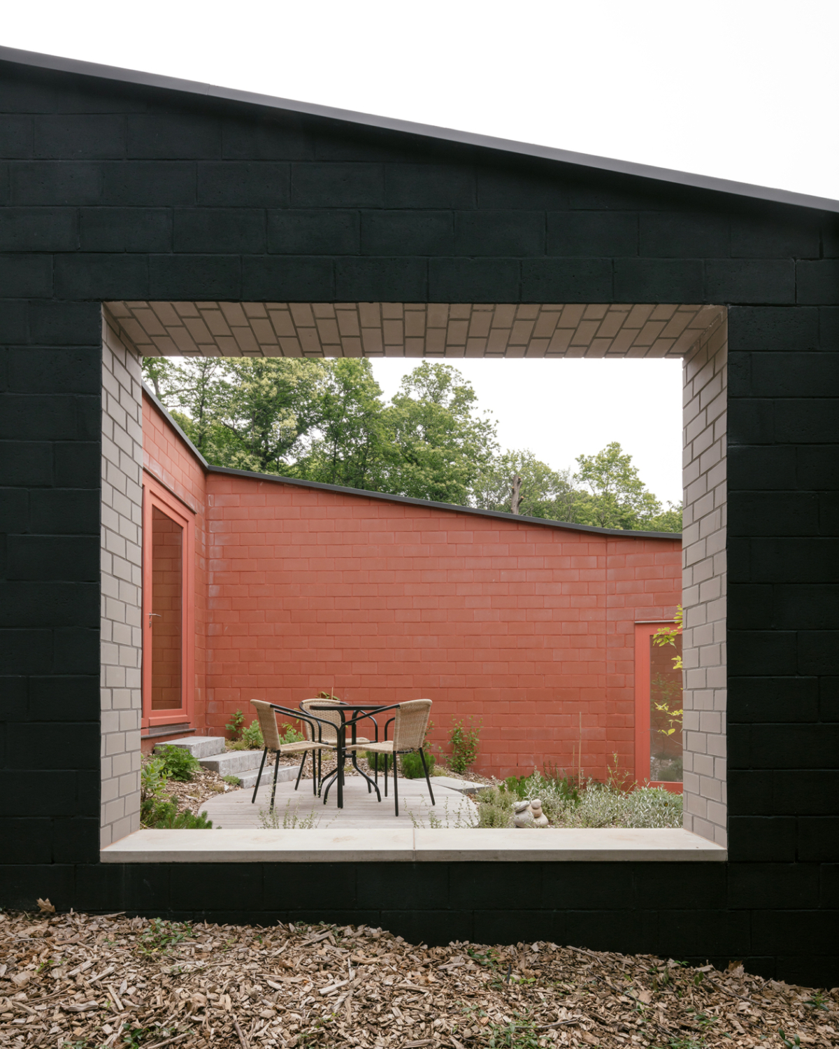 Những viên gạch lớn bên ngoài được sơn màu đen, còn gạch bên trong có màu trắng. Những viên gạch được sử dụng cho sân thượng vẫn giữ được màu sắc tự nhiên của chúng. Theo studio thiết kế, việc sử dụng các màu sắc gạch khác nhau cho các không gian khác nhau đã giúp mang lại cho ngôi nhà một cảm giác vui tươi và vẻ ngoài "không trọng lượng".