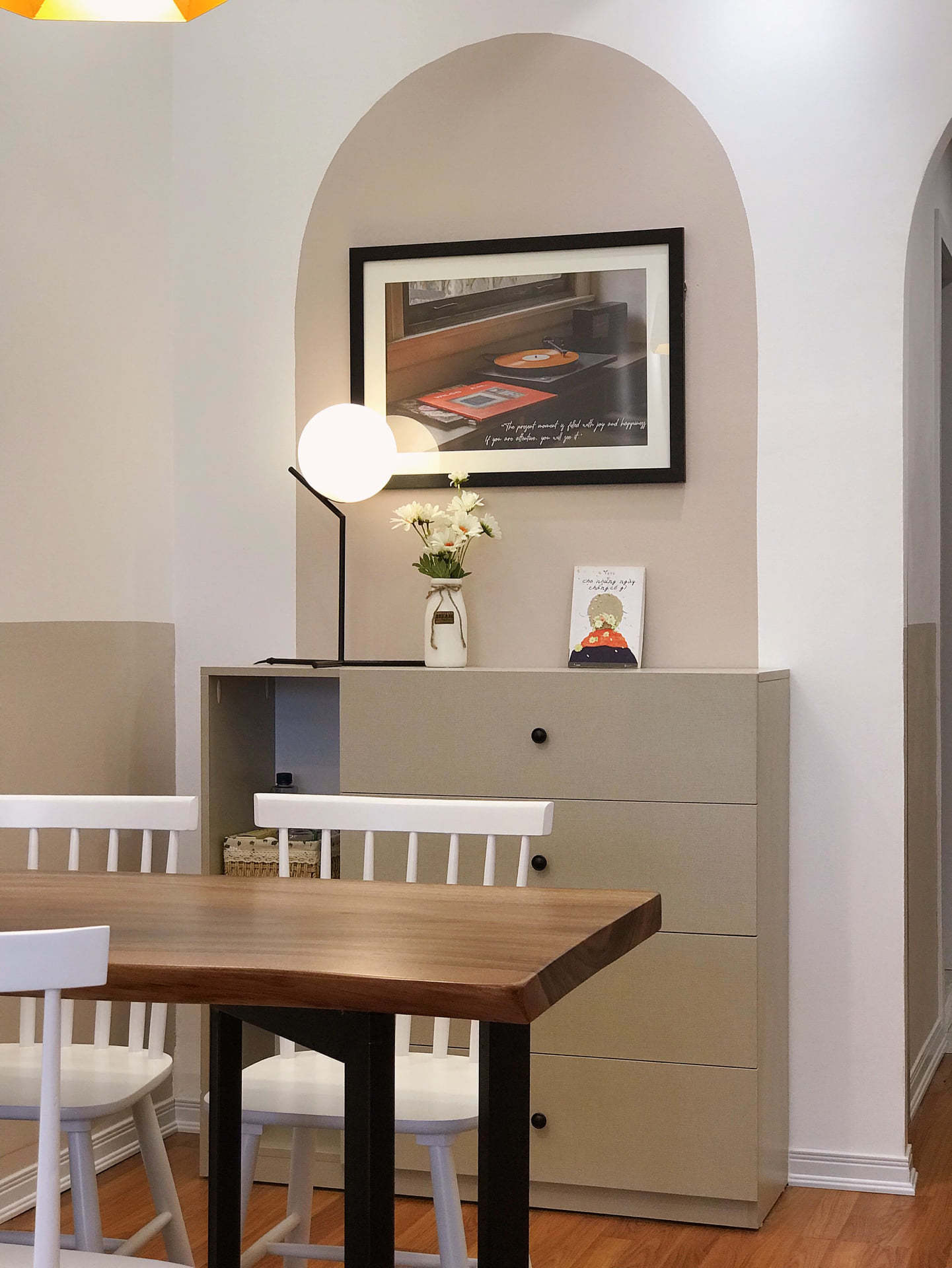 Anh Lê Hòa sử dụng mảng màu đối lập làm điểm nhấn và giúp căn hộ nổi bật hơn. Cạnh bàn ăn là tủ đựng đồ cùng tông màu với mảng tường.