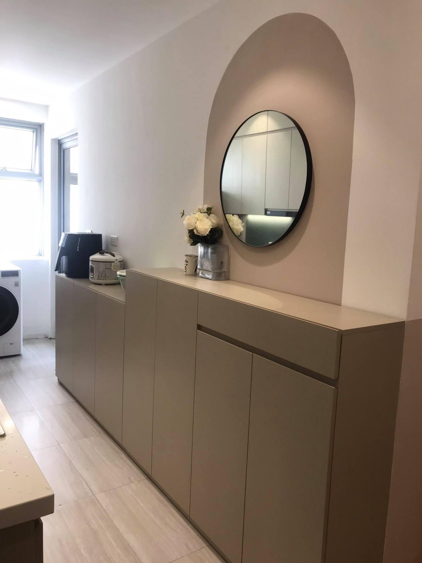 Đối diện tủ giày là bếp nấu và khu để máy giặt sấy, tủ lạnh.