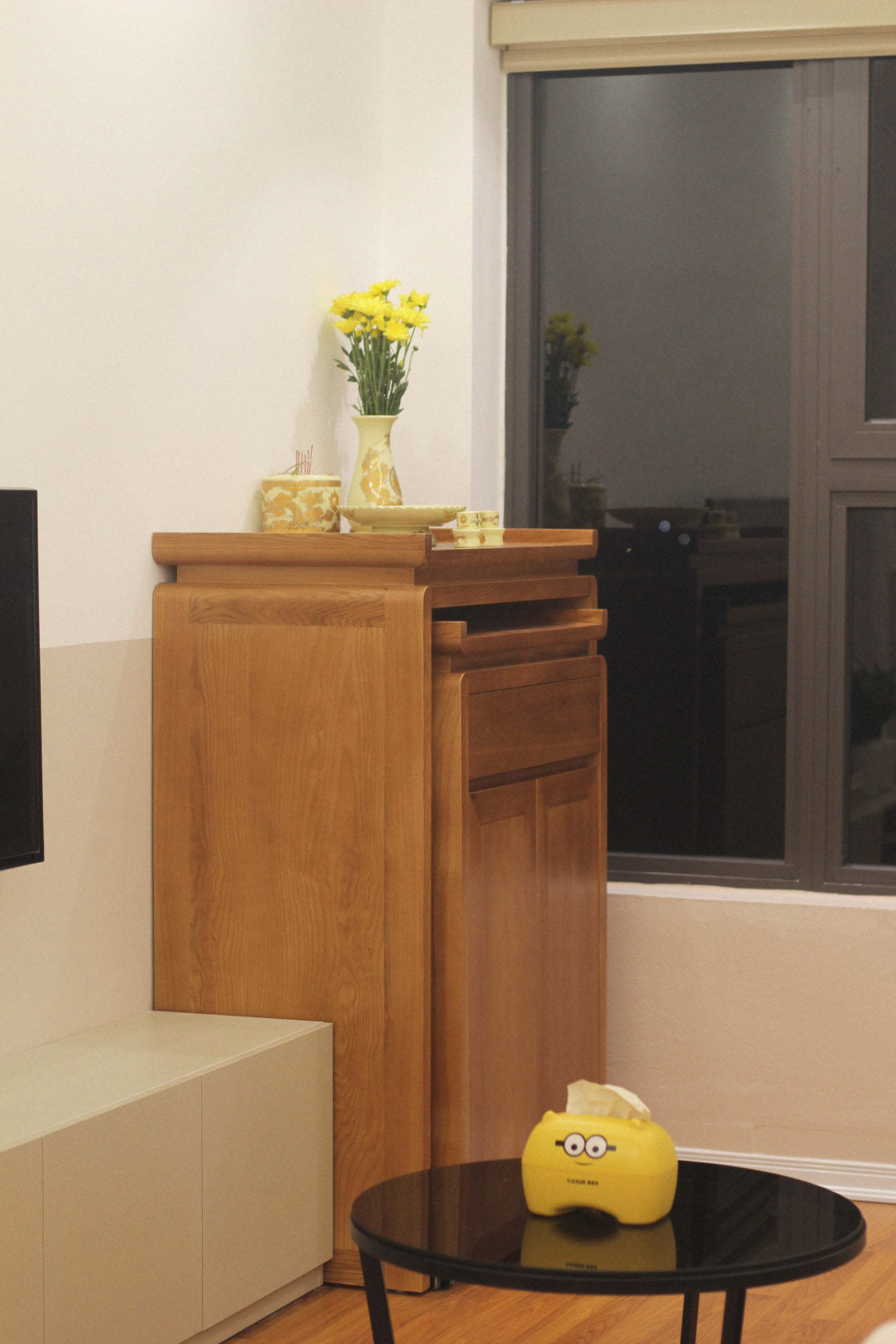 Ban thờ kết hợp tủ đựng, khi đặt mâm cúng, gia chủ chỉ cần kéo phần tủ dưới gầm ra là có nơi rộng rãi bày biện.