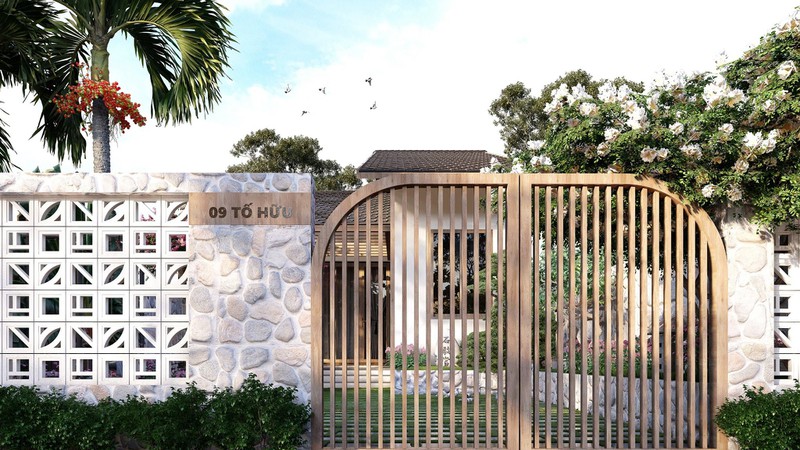 Kiến truc sư Phan Hiển dùng gạch thông gió ô vuông cho tường, đảm bảo sự kín đáo cho bên trong nhưng vẫn quan sát được ngoài đường. Xung quanh vườn ốp đá xanh, lát nền bằng gạch giả bê tông.