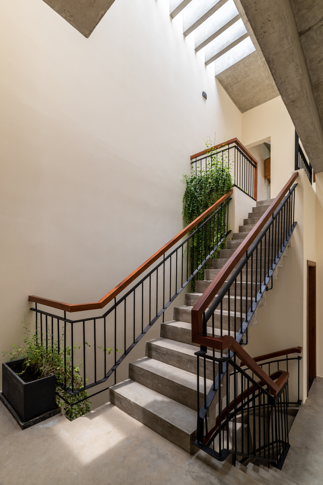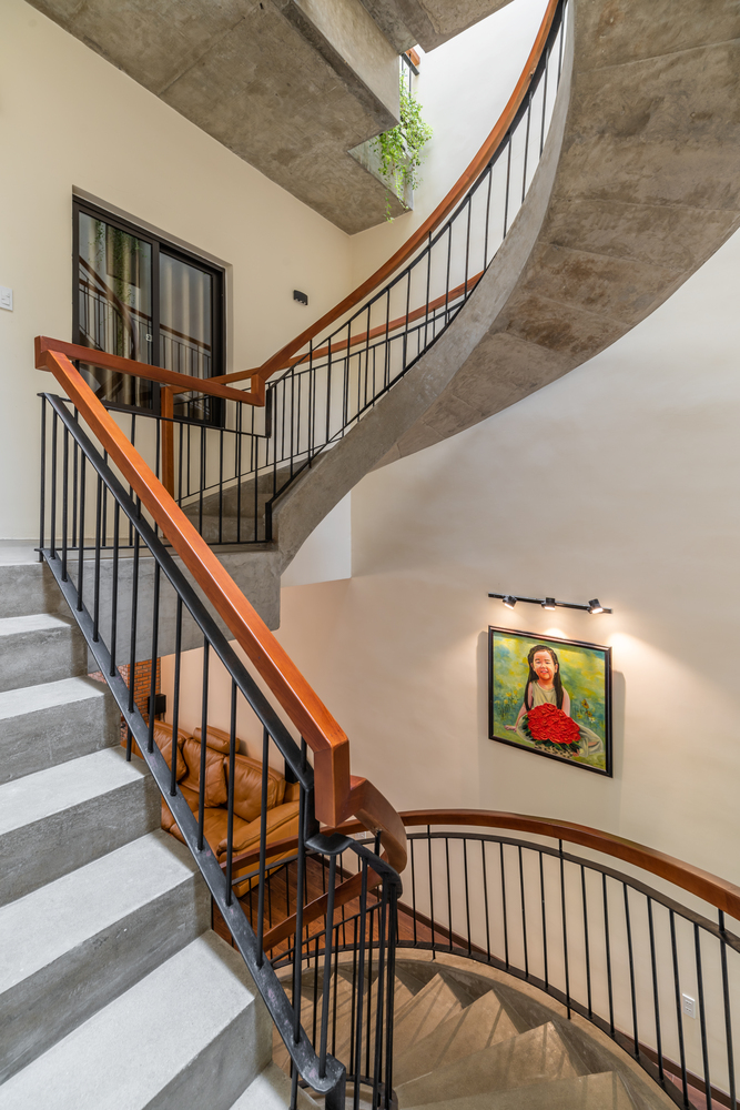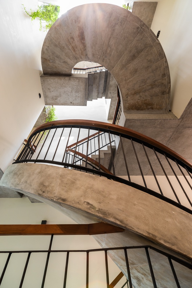Cầu thang được bố trí không đồng trục vừa giúp điều tiết ánh sáng xuống các tầng bên dưới vừa giảm cảm giác về độ cao.