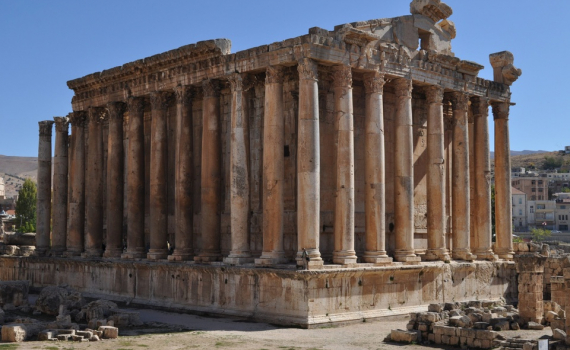 Đền Baalbek ở Lebanon còn được gọi là Heliopolis (thành phố Mặt trời). Đây là khu bảo tồn La Mã cổ đại lớn nhất. Trong suốt hơn 200 năm kể từ thế kỷ 1 TCN, người La Mã đã xây dựng 3 ngôi đền Jupiter, Bacchus, Venus làm nơi thờ cúng các vị thần La Mã. Những ngôi đền này tạo thành quần thể đền lớn nhất trong đế chế La Mã. Đặc biệt, đền Jupiter được bao quanh bởi 54 cột đá hoa cương khổng lồ cao 20 m, đường kính khoảng 2 m. Hiện ngôi đền này chỉ còn lại 6 cột. Đền Bacchus là ngôi đền được bảo tồn tốt nhất với 19 trong số 42 cột đá Corinth còn tồn tại.