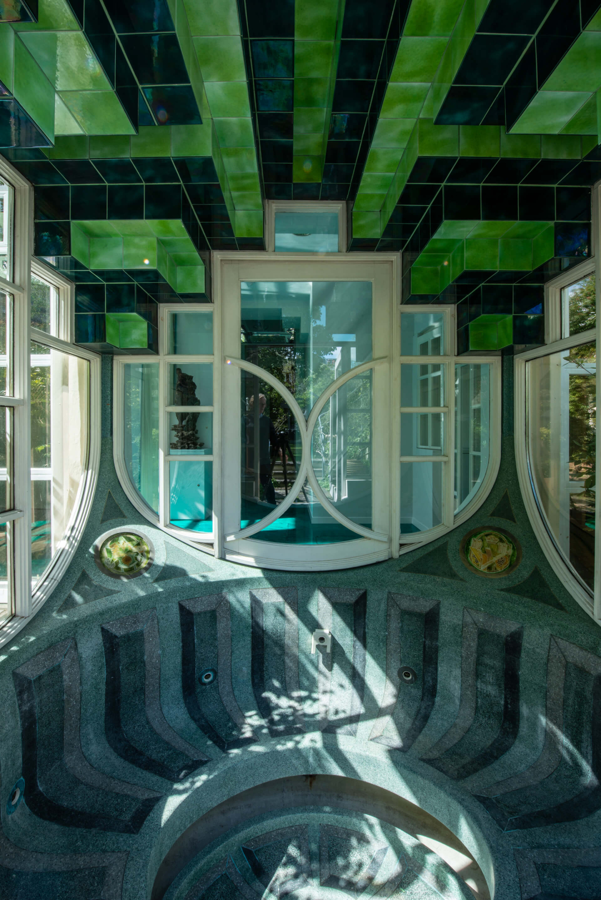 Mọi chi tiết từ trong nhà đến ngoài vườn đều được gia chủ chăm chút cho phù hợp với chủ đề chung. Phòng Triển lãm với hình ảnh mặt trời trên trần và sàn ốp đá, nhìn ra Vườn Thời gian.
