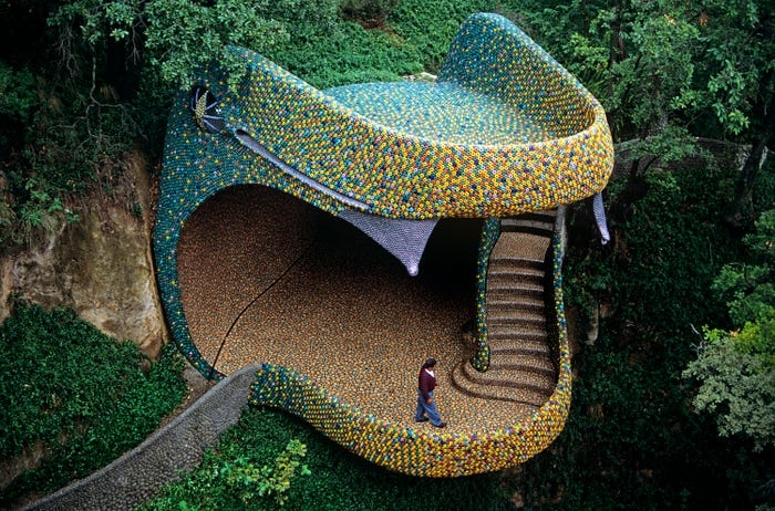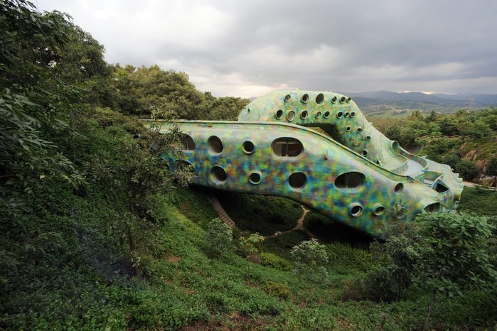 Ẩn mình giữa những ngọn đồi và rừng ây, tổ hợp nhà ở El Nido de Quetzalcóatl có hình dáng như một con rắn. Đây là công trình do kiến trúc sư người Mexico Javier Senosiain thiết kế, lấy cảm hứng từ Quetzalcóatl, vị thần rắn có lông vũ của người Aztec.