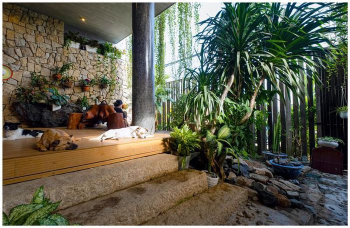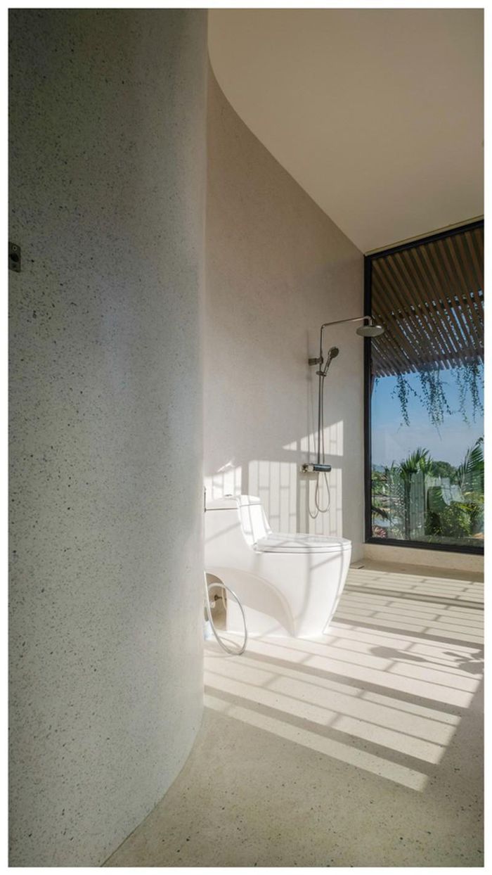 Khu vực tắm cũng gắn kết với thiên nhiên, có cây xanh và sàn bằng đá sỏi.