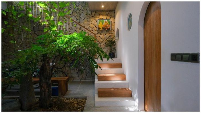 Tại vị trí cầu thang có cây xanh và ánh sáng len lỏi tạo nên hiệu ứng thị giác.