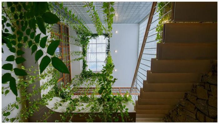 Giếng trời, thông tầng kết hợp cây leo là giải pháp lấy sáng và gió trong nhà.
