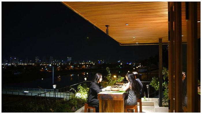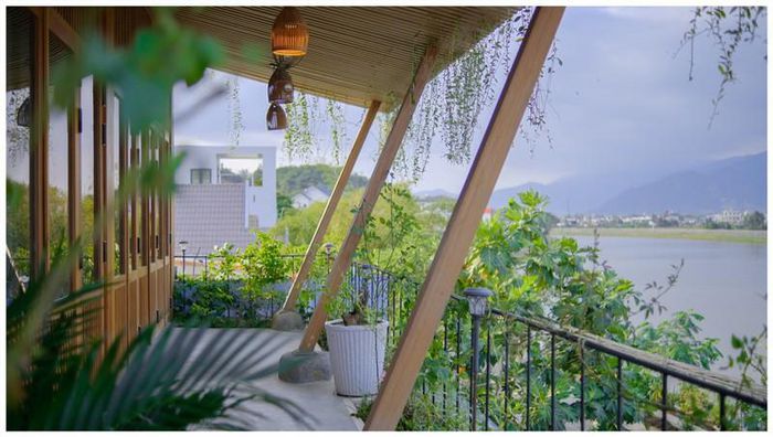 Khoảng sân thượng và hàng hiên với tầm nhìn hướng về một dòng sông đẹp, xa xa là thành phố yên bình.