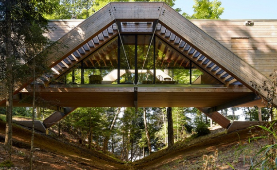 Đúng như tên gọi, “Bridge House” gây ấn tượng mạnh mẽ ngay từ cái nhìn đầu tiên với tạo hình cây cầu. Hình dáng khác lạ này cũng chính là nguyên nhân dẫn đến việc công trình sở hữu hẳn hai mặt tiền: Một là đối diện với hồ đóng vai trò như một ban công để thưởng ngoạn cảnh quan tuyệt đẹp đằng trước; mặt còn lại đối diện với khu rừng lá kim rậm rạp.