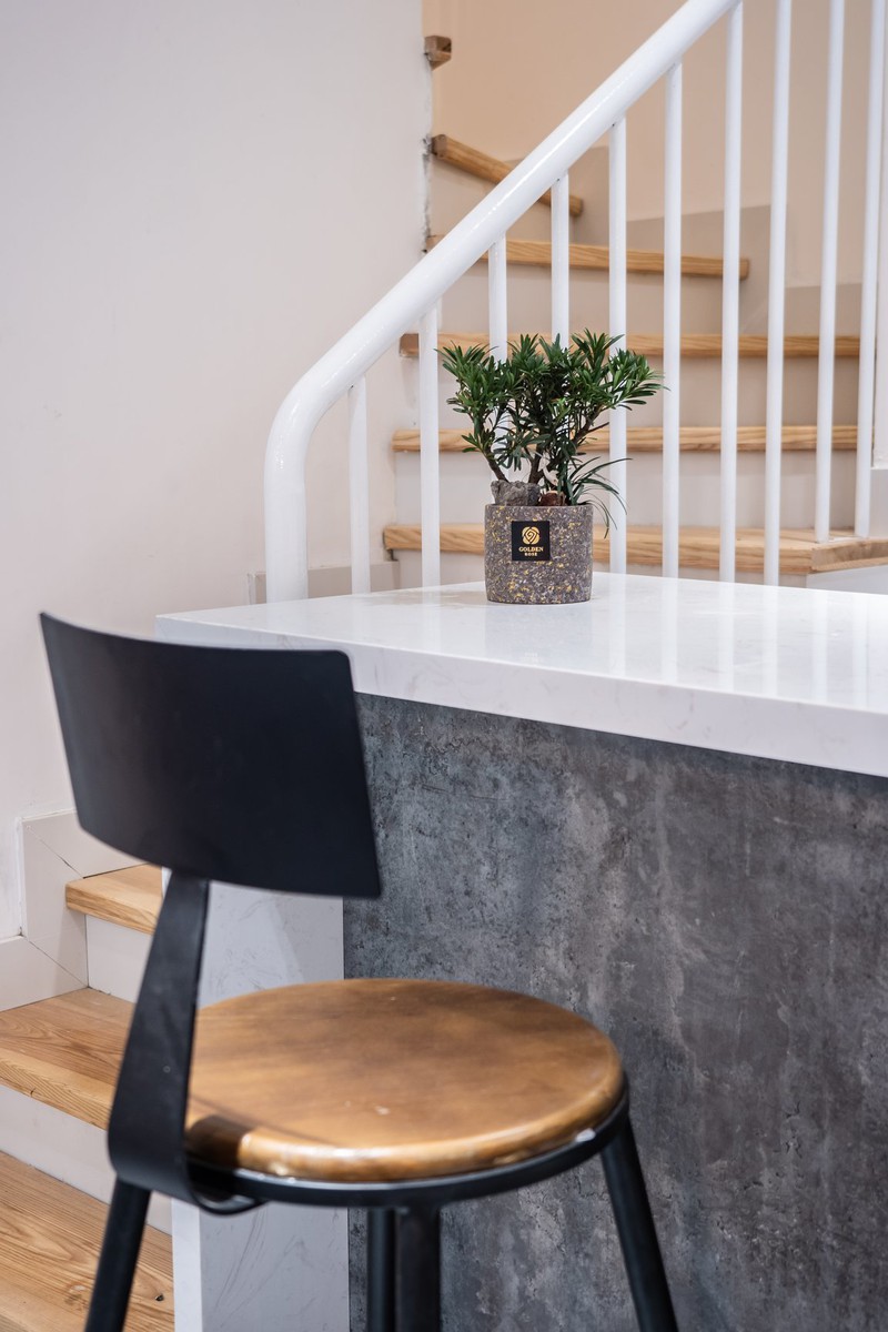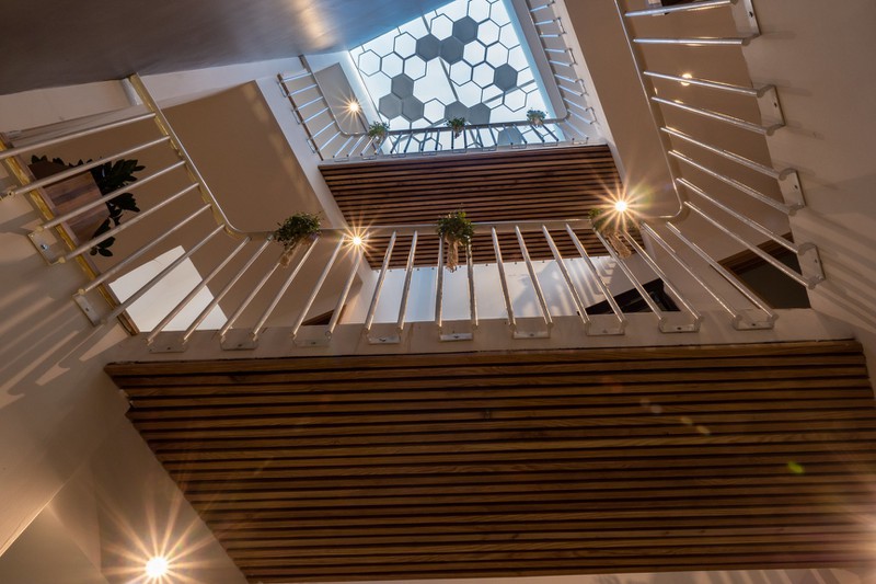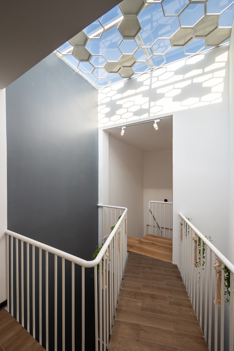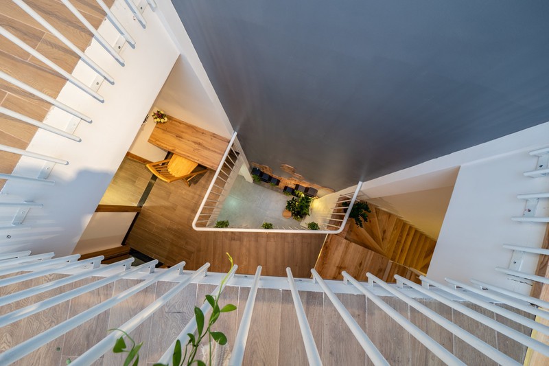Điểm độc đáo của ngôi nhà là khu vực cầu thang. Chính vì muốn làm giếng trời để lấy ánh sáng, không khí cho toàn bộ nhà nên phía dưới có các khoảng không lớn, các không gian trên tầng kết nối bằng "chiếc cầu" nhỏ. Tay vịn cầu thang là sắt rỗng, sơn tĩnh điện.