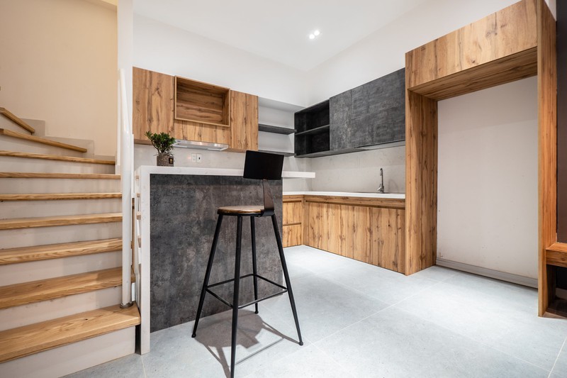 Phòng bếp sử dụng màu gỗ ấm, hài hòa với nội thất của nhà. Chất liệu bằng gỗ tự nhiên được xử lý chống mối mọt, chống ẩm nên không lo bị co ngót hay cong vênh.